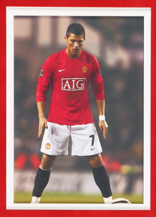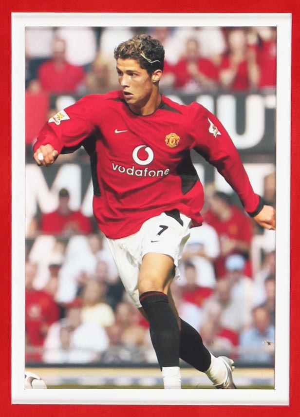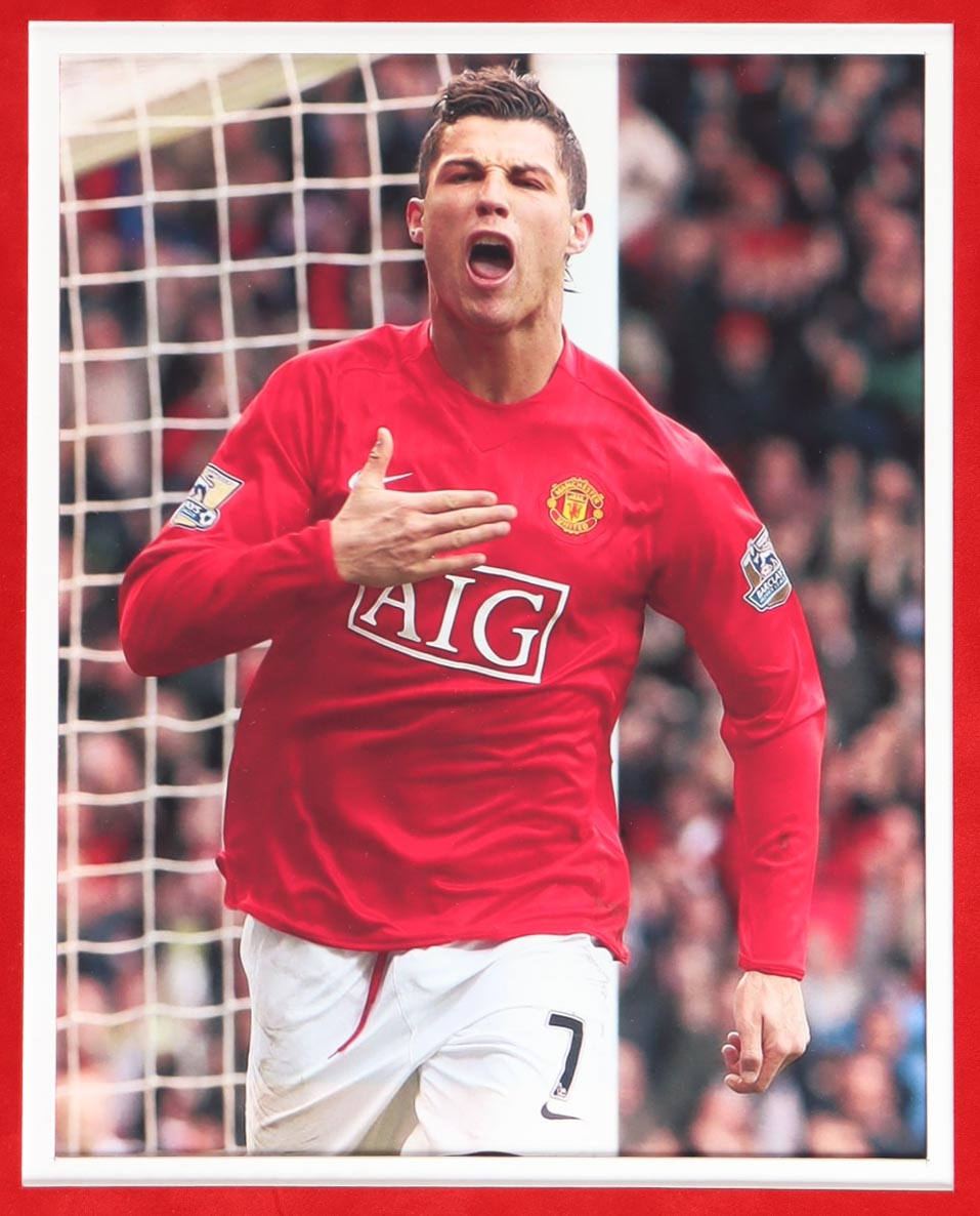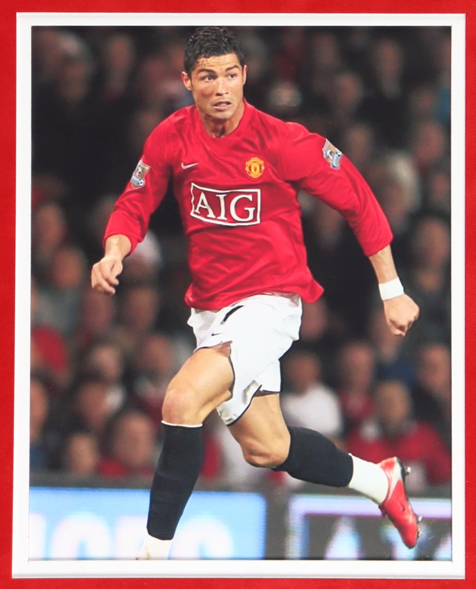 Custom frame display measures approximately 34" x 42" in size and features a jersey that has been hand-signed by Cristiano Ronaldo. Display also (4) 8" x 10" photos.