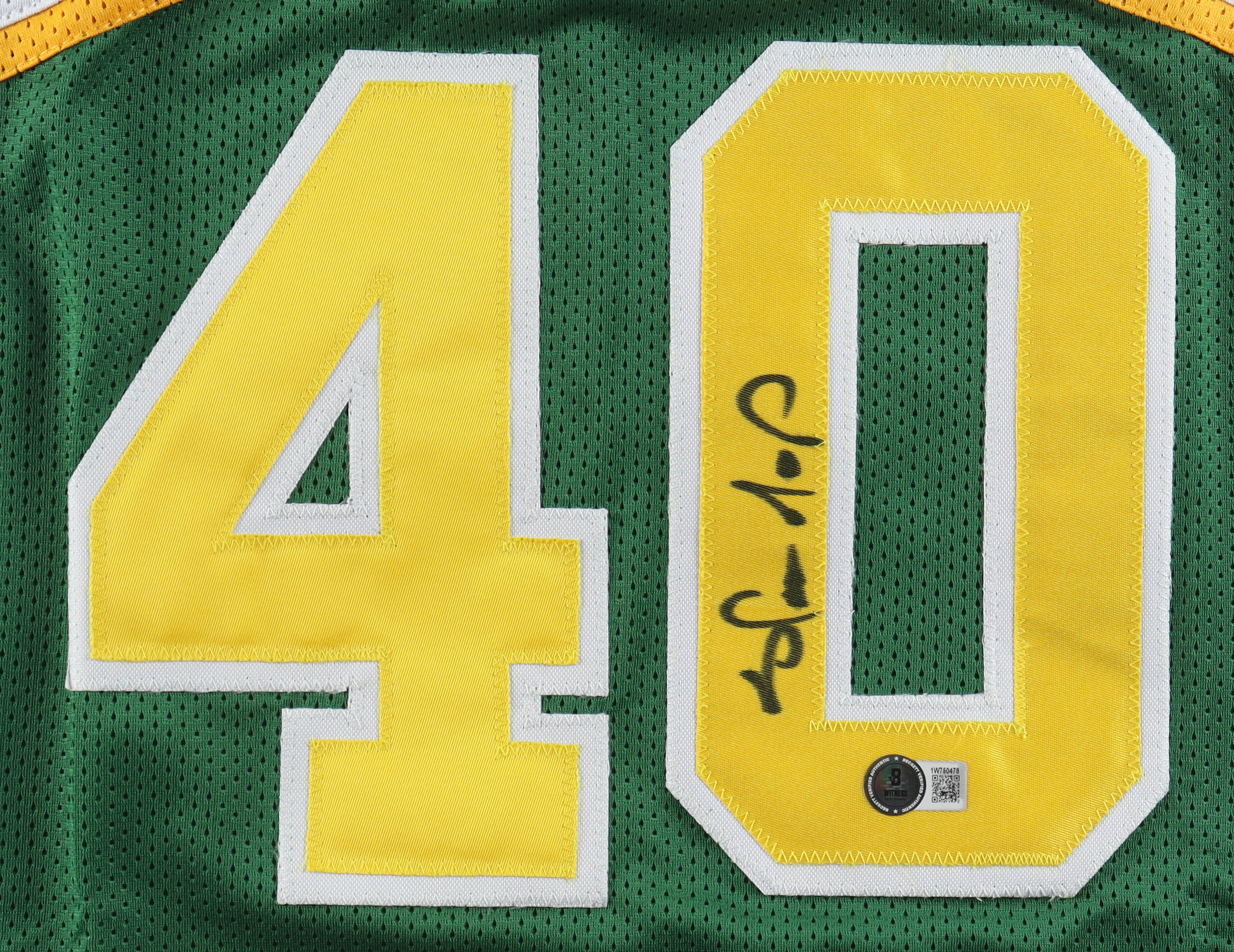Custom jersey with everything sewn on, size XL. Hand-signed by Shawn Kemp. Please note, the signature has bled.