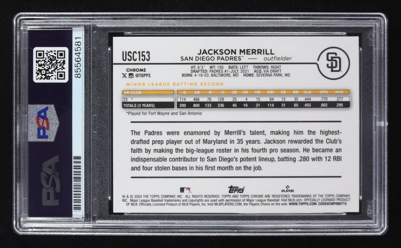 Jackson Merrill Signed 2024 Topps Chrome #USC153 RC (PSA Autograph Graded 10)