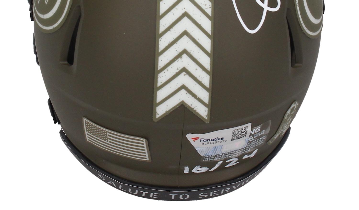 Riddell San Francisco 49ers Salute to Service Alternate Speed mini helmet. Hand-signed and inscribed by Joe Montana (HOF). The helmet is limited edition and hand-numbered #/24.