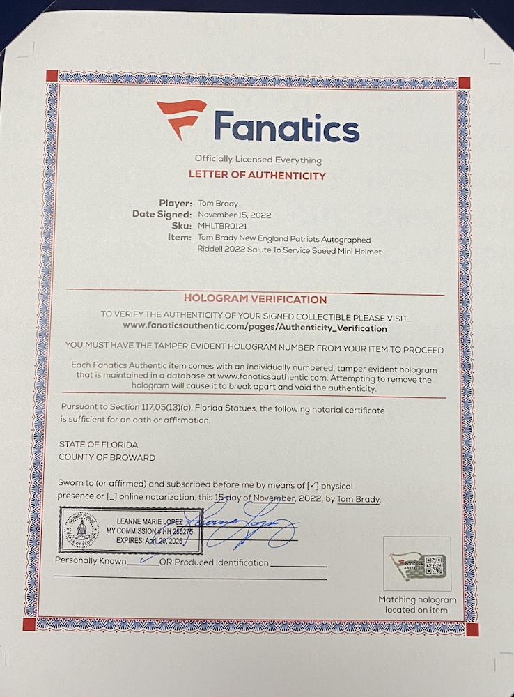 The autograph includes an official Fanatics hologram and matching LOA for authenticity purposes.