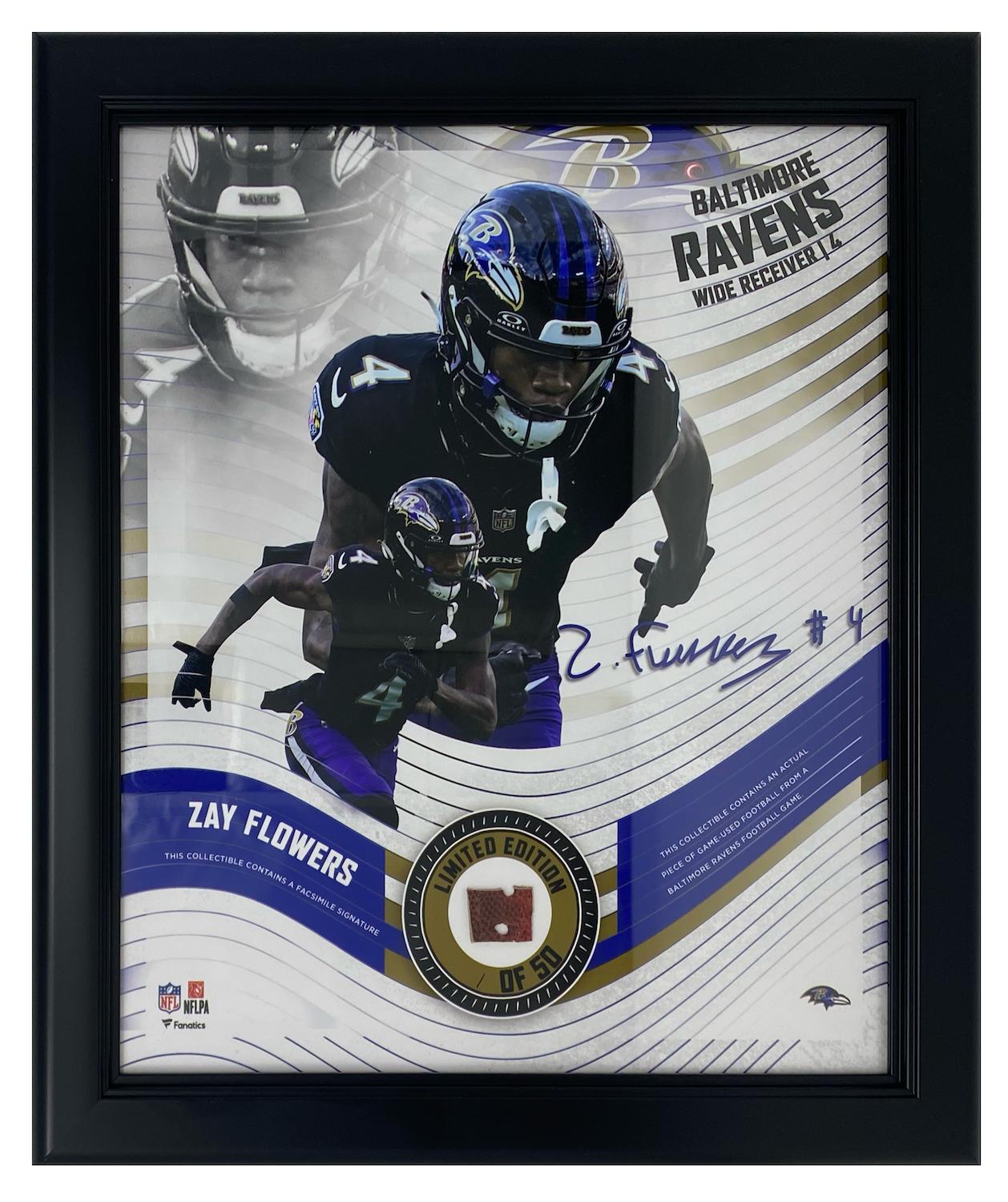 Custom frame measures 15" x 17" and features a piece of a game-used football as well as a photo of Zay Flowers (Baltimore Ravens). You will receive number "1" from the limited edition series. Please note, the signature is a facsimile signature.