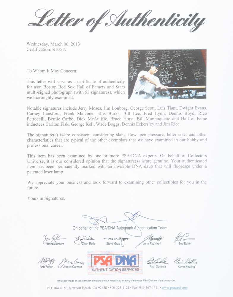 Photo measures 20" x 24" in size and has been hand-signed by (53) of the greatest players of the Boston Red Sox including Hall of Famers Carlton Fisk, Wade Boggs, and Jim Rice!
