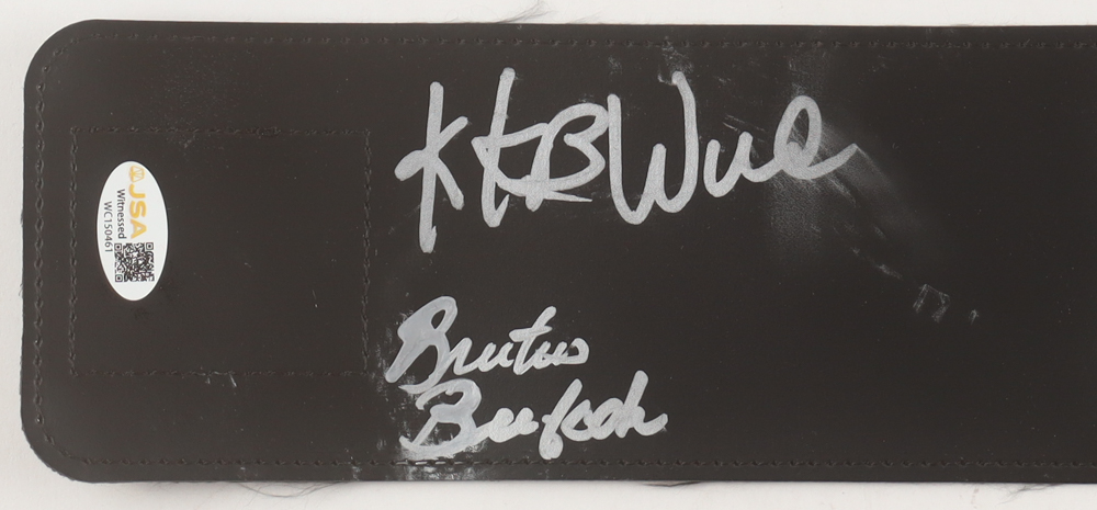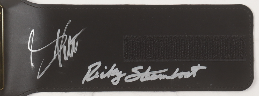 WWE plastic toy replica championship belt. Measures approximately 37" in length. Hand-signed by Ricky Steamboat (HOF), Koko B. Ware, Brutus Beefcake (HOF), and Greg Valentine (HOF).