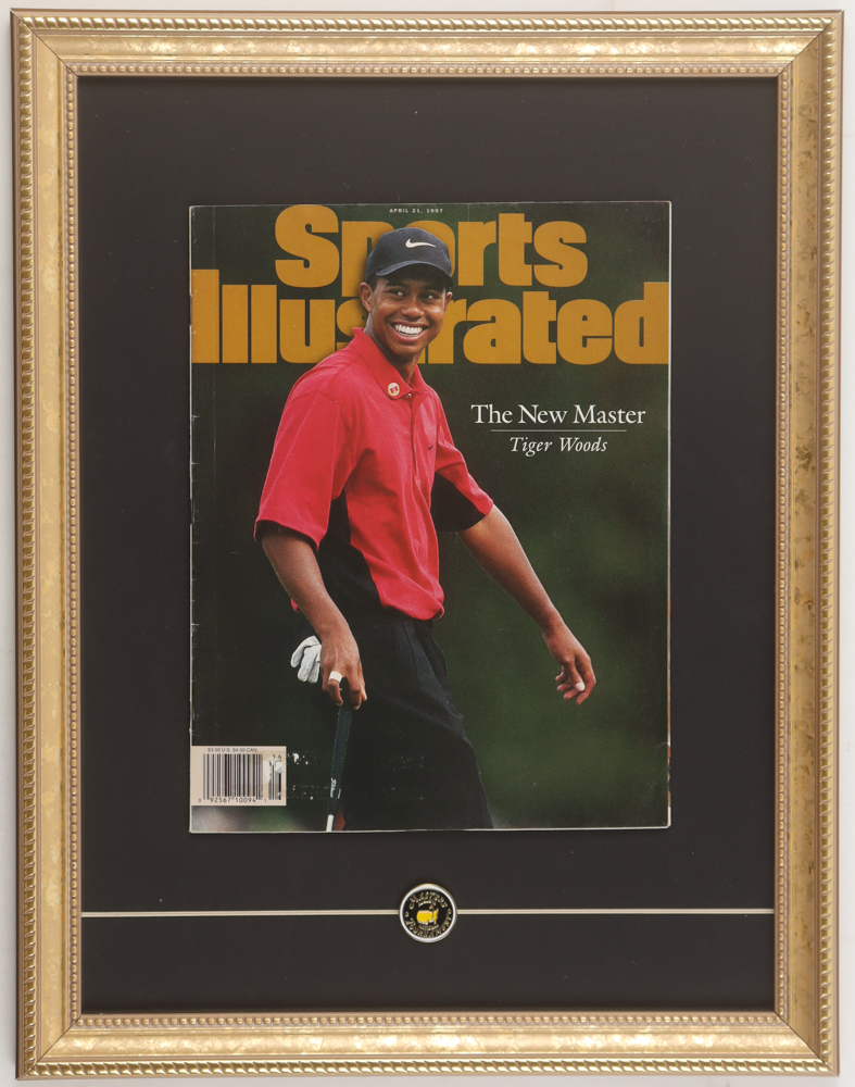 Custom frame measures approximately 14" x 18" in size. The Sports Illustrated Magazine is dated April 21st, 1997 and features Tiger Woods (HOF). The display also includes a Masters Tournament Pin. Please note, the display is unsigned. Please see photo for details regarding the condition of the magazine.