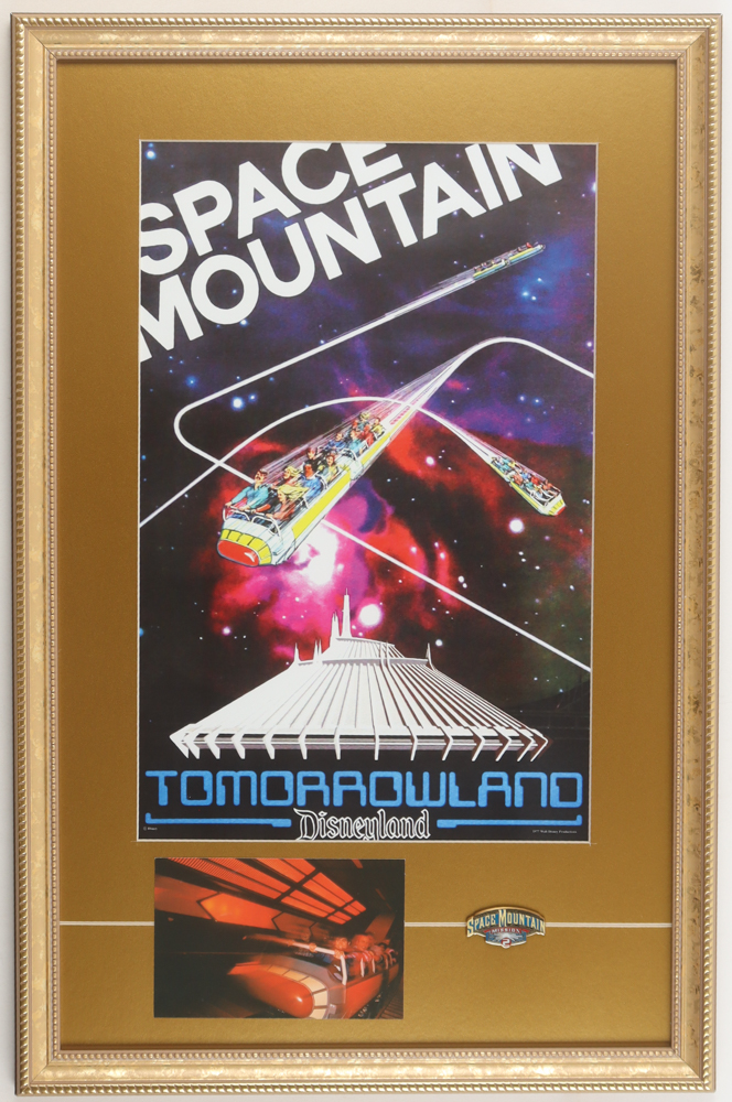 Custom frame measures approximately 17" x 26" in size. The display features a Disneyland "Space Mountain" Poster Print, as well as an official Ride Pin and retired Souvenir Postcard. Please note, the display is unsigned. Please see photo for details regarding the condition of the print.