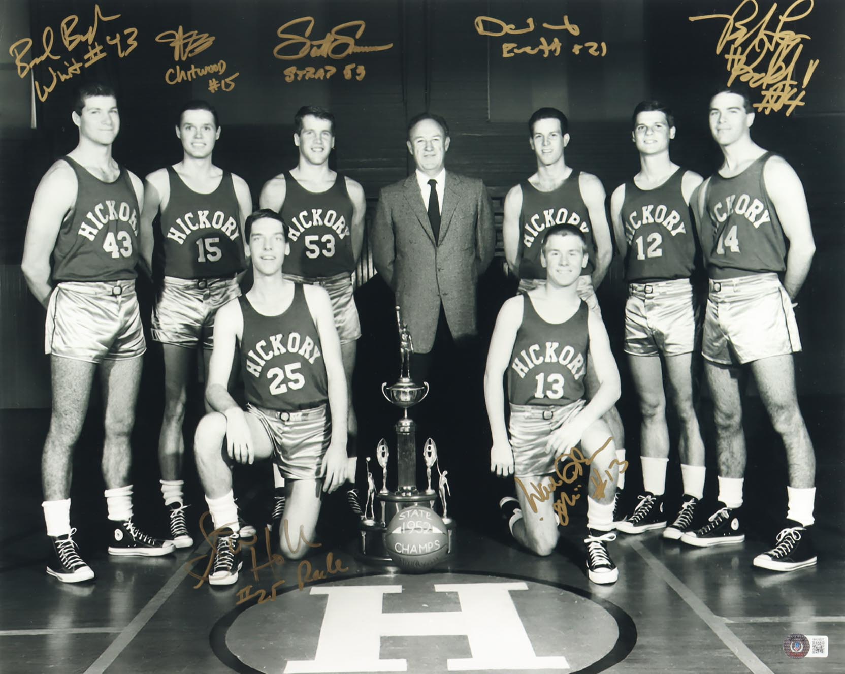 Photo measures approximately 16" x 20" in size and has been hand-signed and inscribed by David Anspaugh (Director), Wade Schenck (Ollie), Brad Boyle (Whit Butcher), Steve Hollar (Rade), Maris Valainis (Jimmy Chitwood), Scott Summers (Strap Purl), Brad Long (Buddy), and David Neidorf (Everett Fletch).