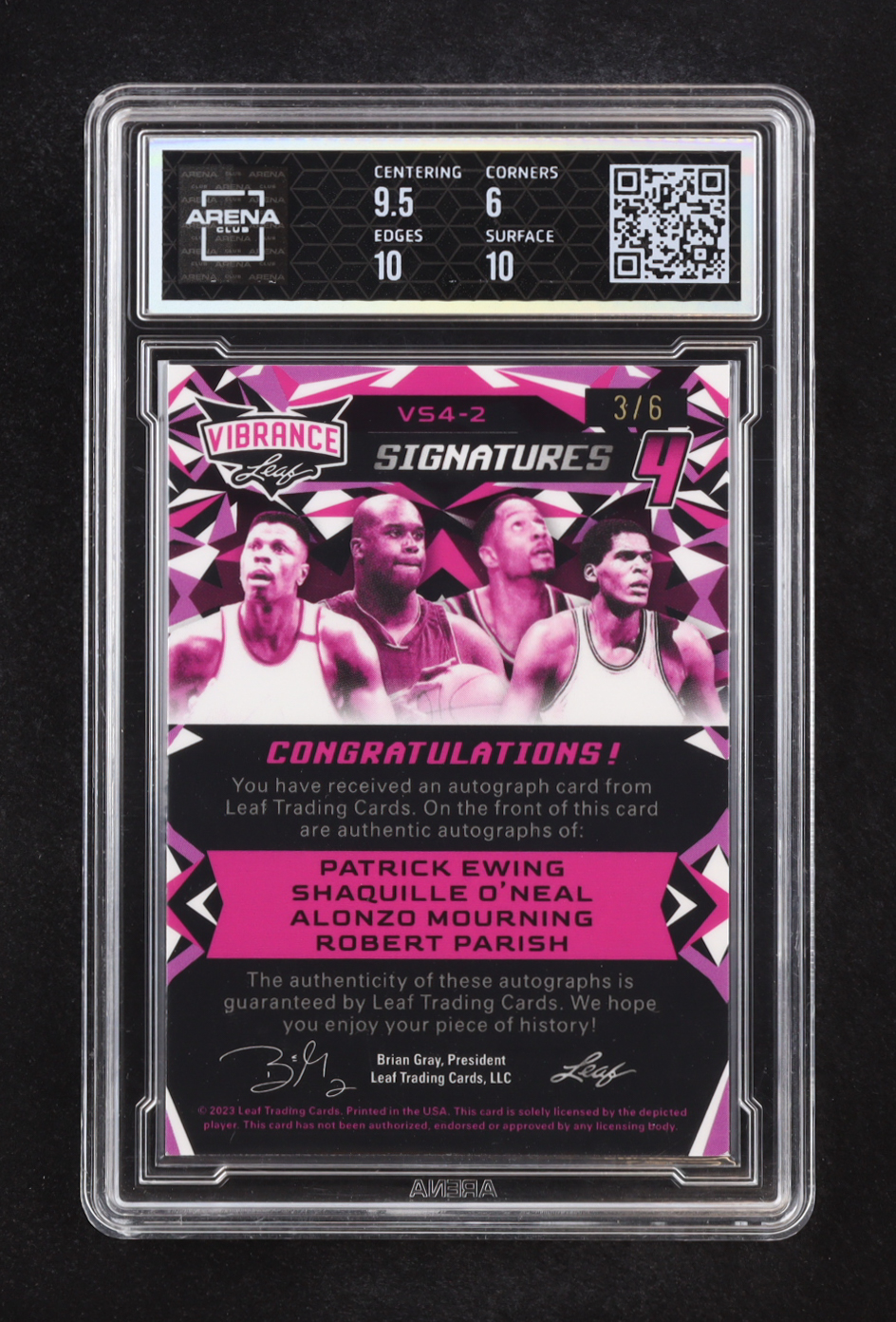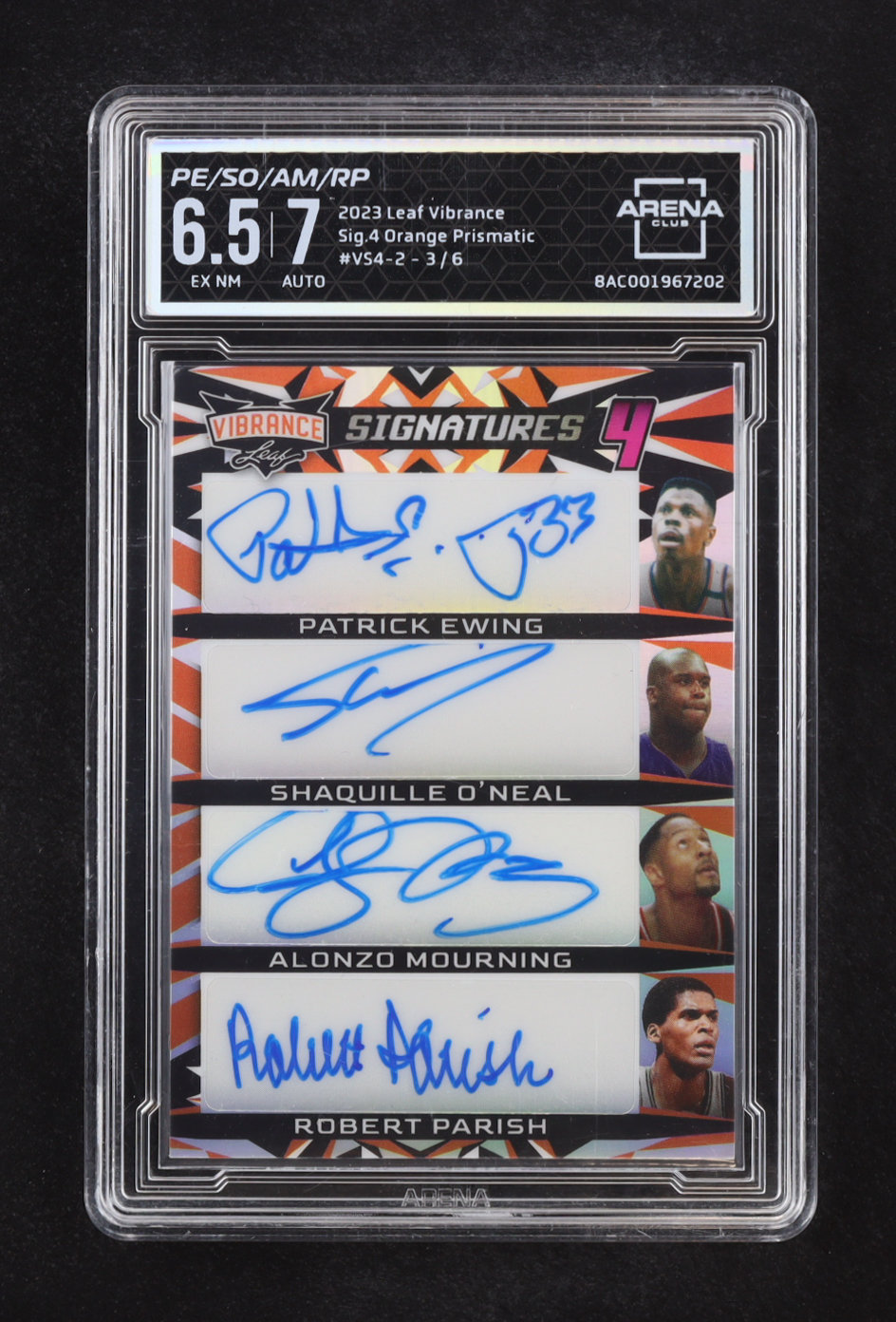 Patrick Ewing/Shaquille O'Neal/Alonzo Mourning/Robert Parish 2023 Leaf Vibrance Sig 4 Orange Prismatic Signatures #VS4-2 #3/6 (Arena Club 6.5 | Autograph Graded 7)