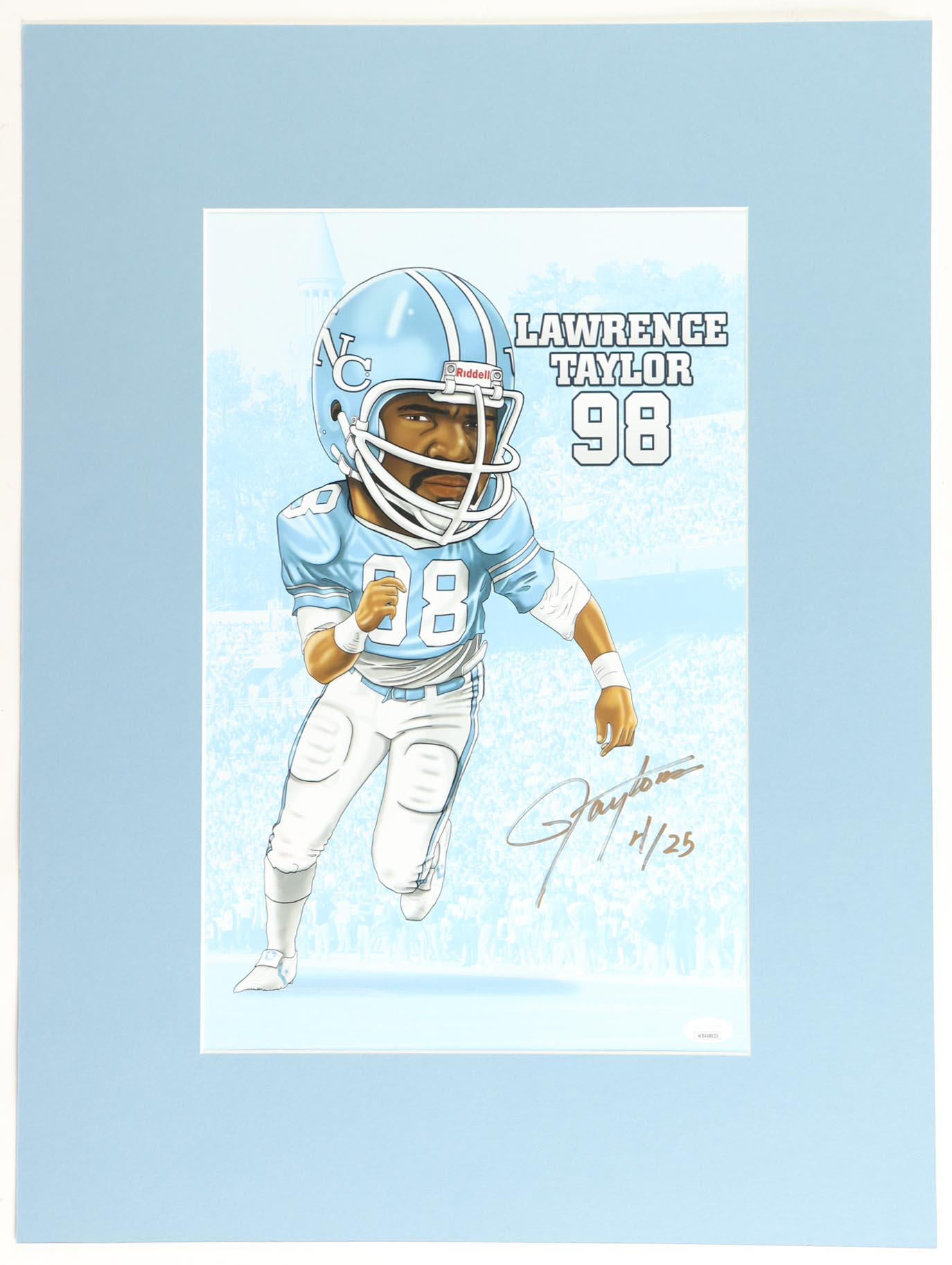 Custom lithograph measures 18" x 24" in size, featuring a cut that has been hand-signed by Lawrence Taylor (New York Giants, HOF). Please note that the item has been labeled Limited Edition # 4 / 25.