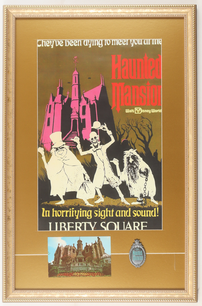Custom frame measures approximately 17" x 26" in size. The display features a Disney World "Haunted Mansion" Poster Print, as well as an official Pewter Ride Emblem and a retired Souvenir Postcard. Please note, the display is unsigned. Please see photo for details regarding the condition of the print.