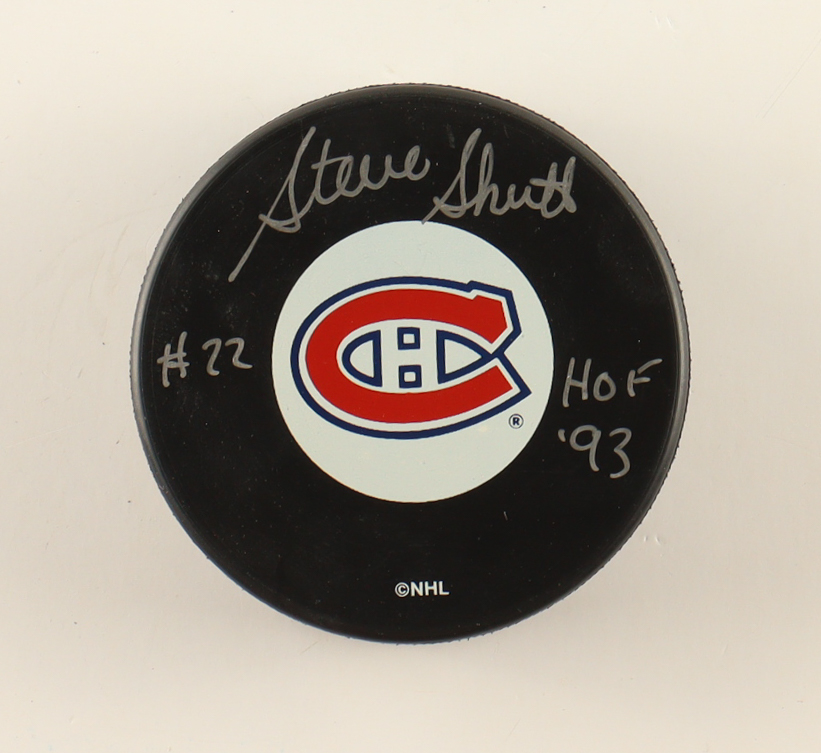 Montreal Canadiens Logo Hockey Puck. Hand-signed and inscribed by Steve Shutt.