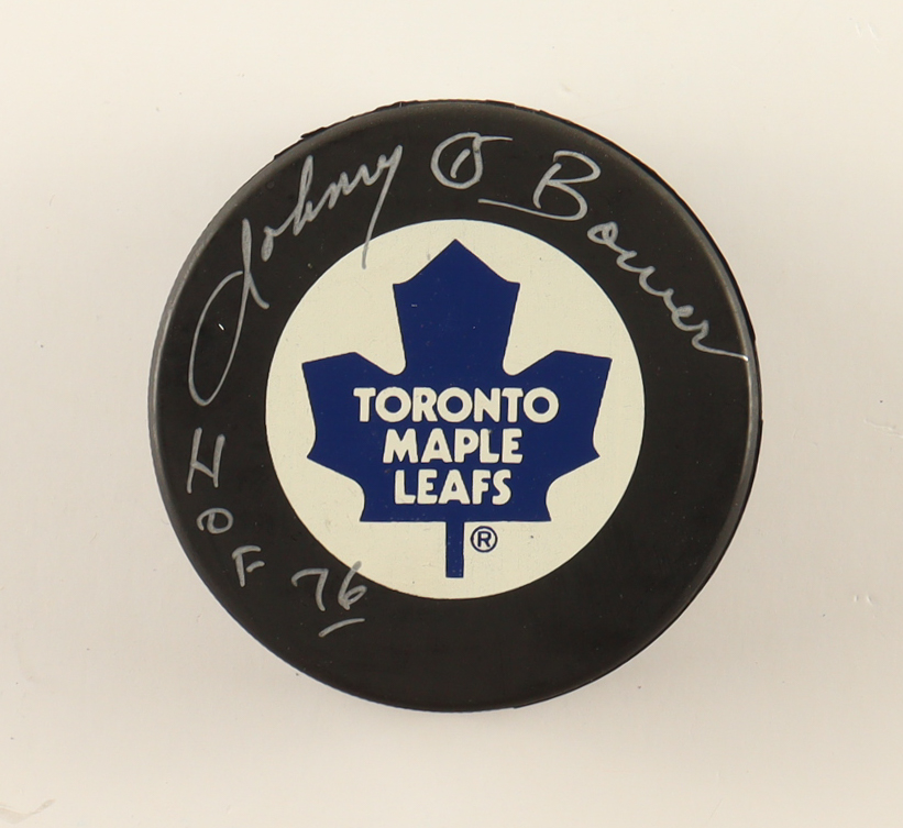 Toronto Maple Leafs logo hockey puck. Hand-signed and inscribed by Johnny Bower (D. 2017, HOF).