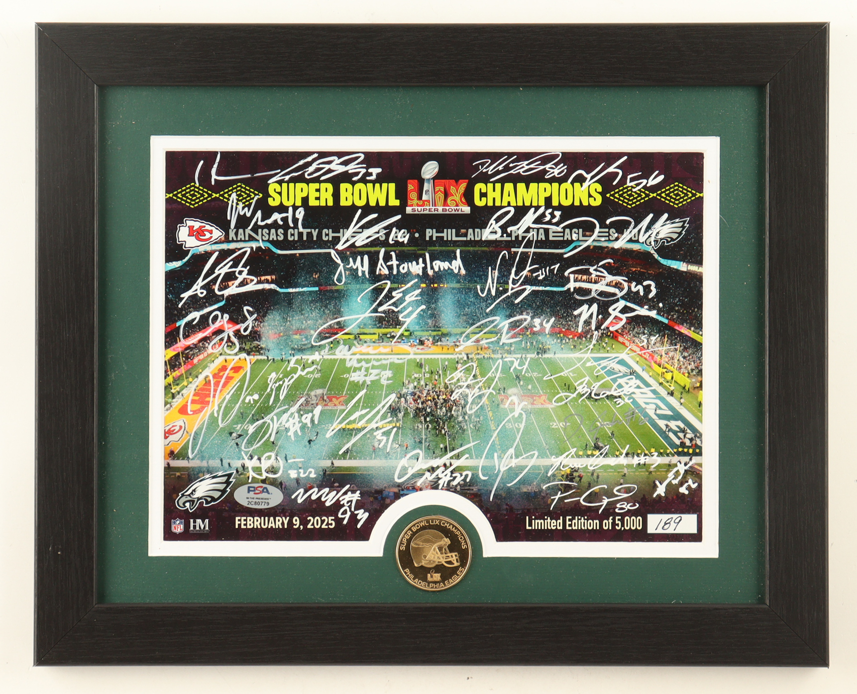 Custom frame measures 13" x 16" in size, featuring a photo that has been hand-signed by (26) with Quinyon Mitchell, Milton Williams, Josh Sweat, Kenneth Gainwell, Howie Roseman, Darius Slay, C.J. Gardner-Johnson, A.J. Brown, Dallas Goedert, Brandon Graham, Jordan Davis, Ainias Smith, Kelee Ringo, Cooper DeJean, Moro Ojomo, Devonta Smith, Nolan Smith, Tristin McCollum, Jeremiah Trotter Jr., Fred Johnson, Nakobe Dean, Jake Elliott, Darian Kinnard, Cameron Jurgens, Isaiah Rodgers and Sydney Brown. Display also comes with a Commemorative Eagles Super Bowl coin.