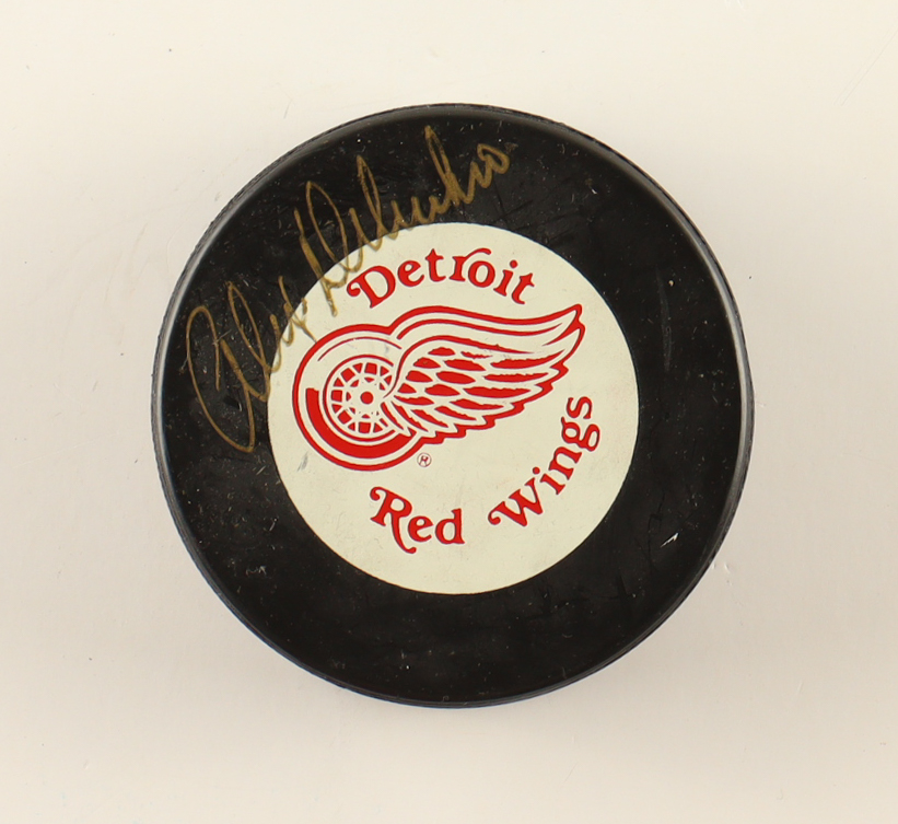 Detroit Red Wings logo hockey puck has been hand-signed by Alex Delvecchio.