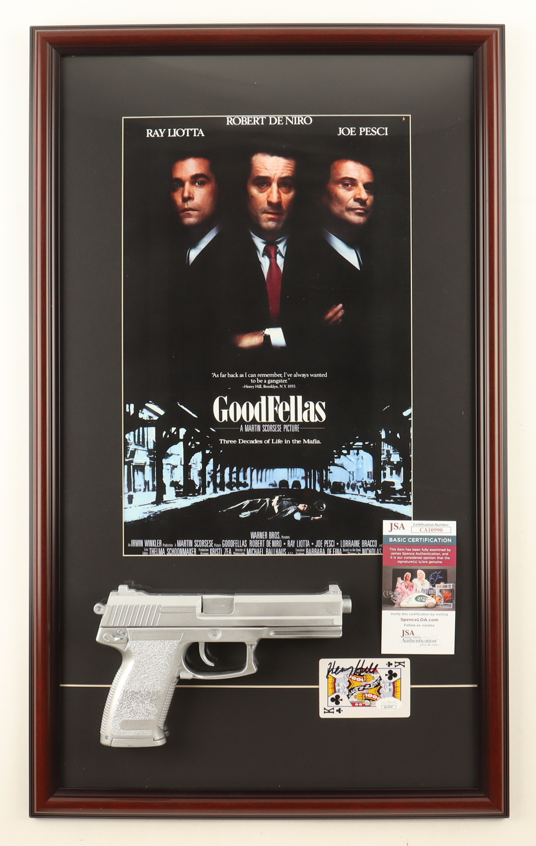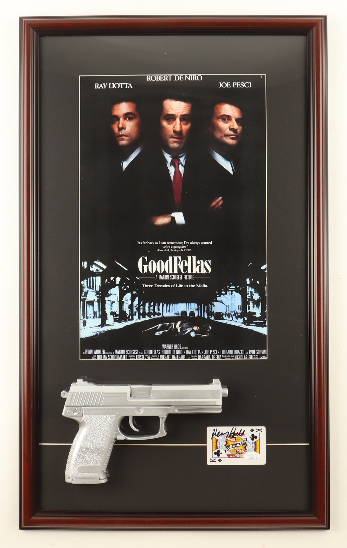 Custom frame measures 18" x 30" in size. Two of clovers playing card has been hand-signed by Henry Hill. Display also includes a movie poster and replica toy pistol.