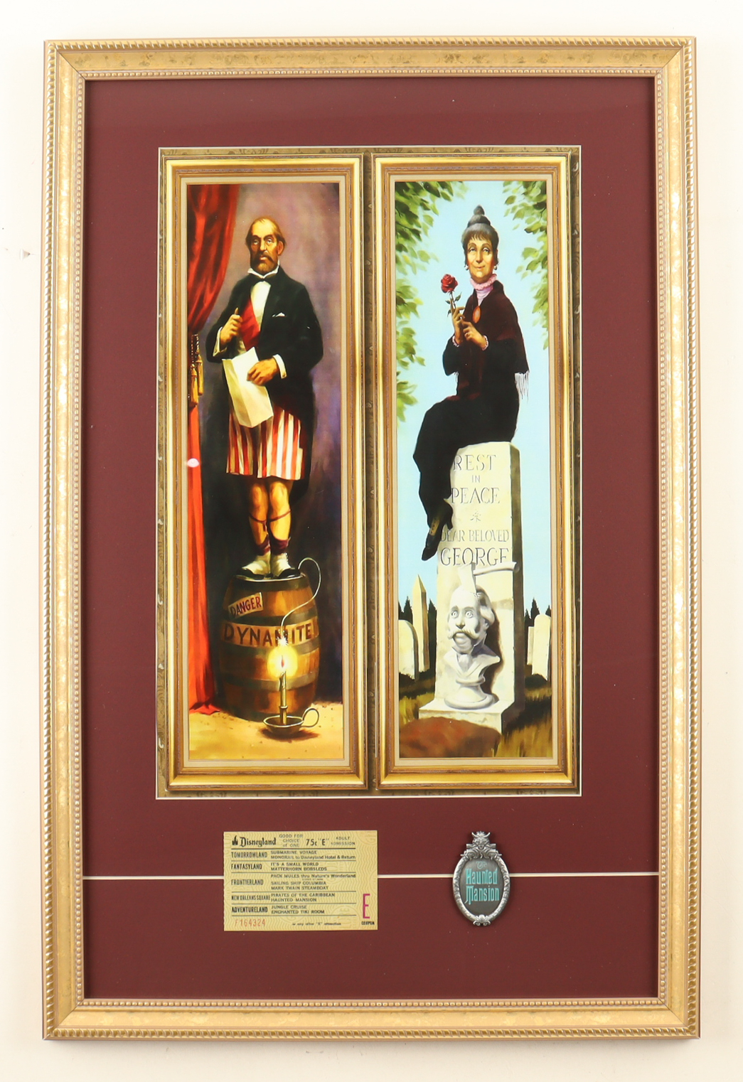 Custom frame measures 17" x 26" in size. Display features an 11" x 17" Haunted Mansion theme park ride poster. Display also includes a Disneyland ride tickey and Haunted Mansion emblem.