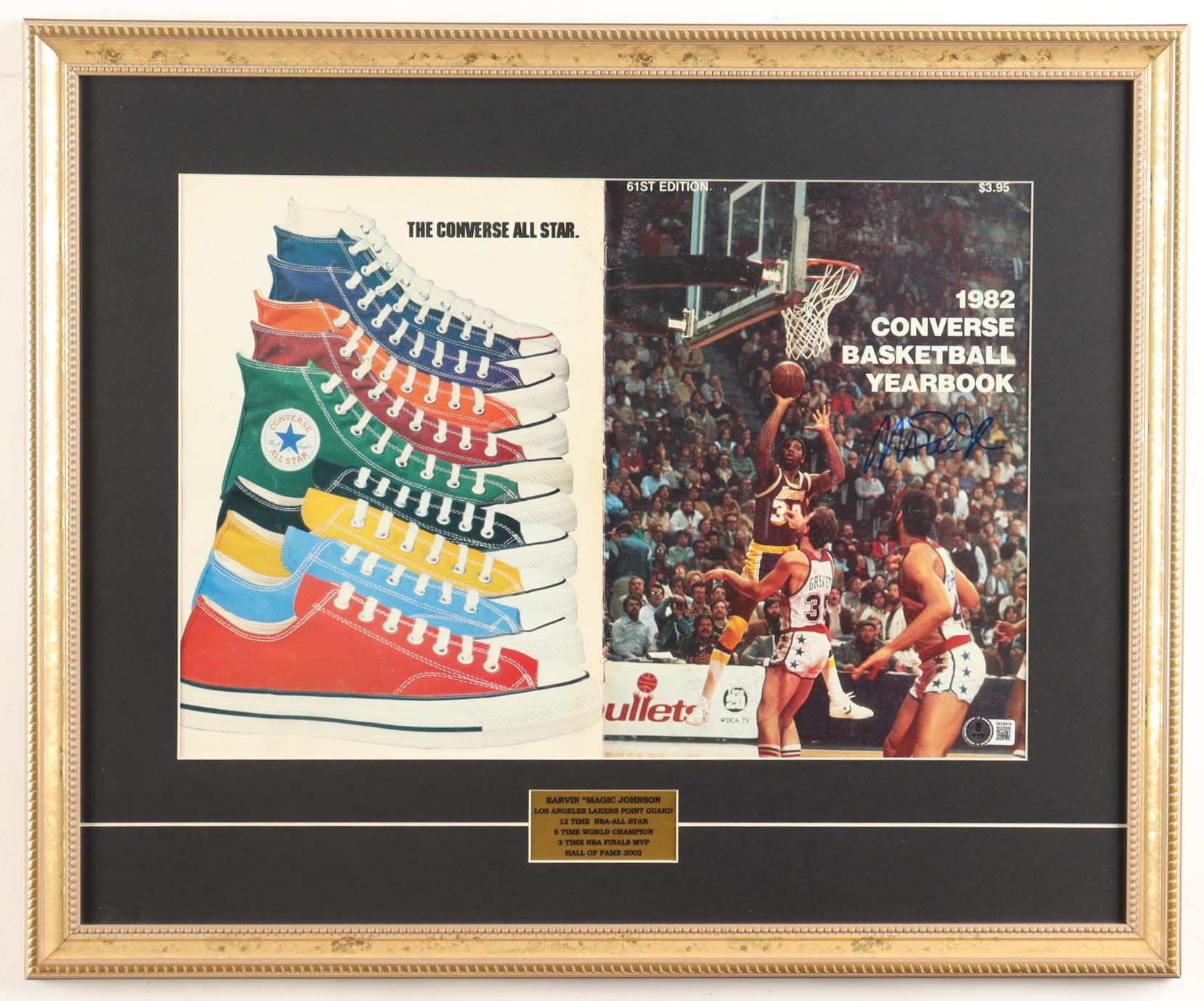 Custom frame measures 19" x 23" in size. 1982 Converse All-Star Program has been hand-signed by Magic Johnson (Los Angeles Lakers, HOF). Display also features a career statistics plaque.