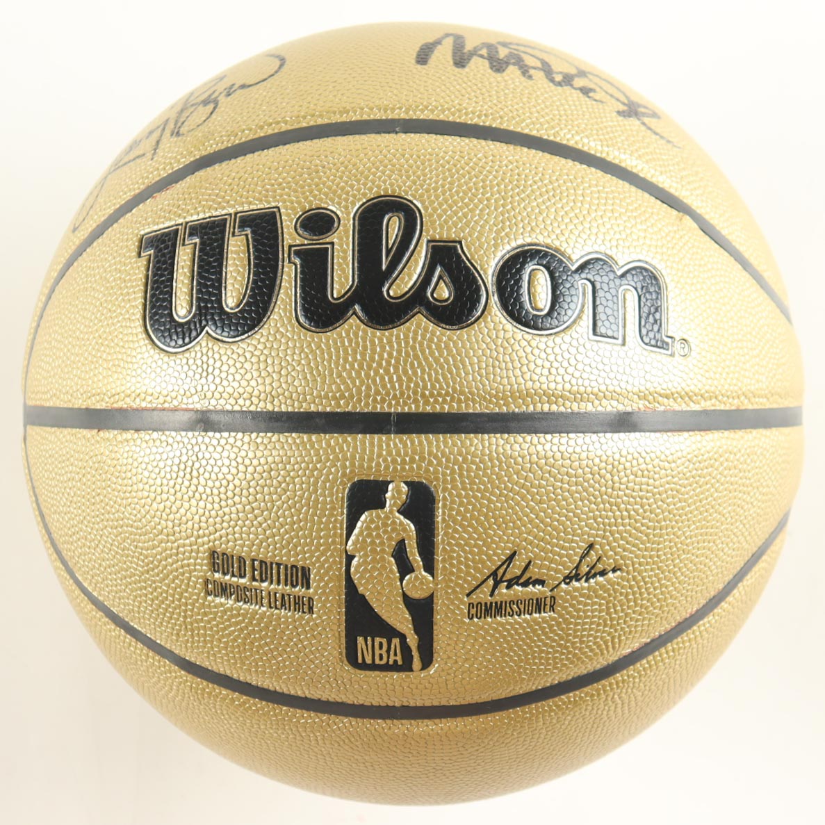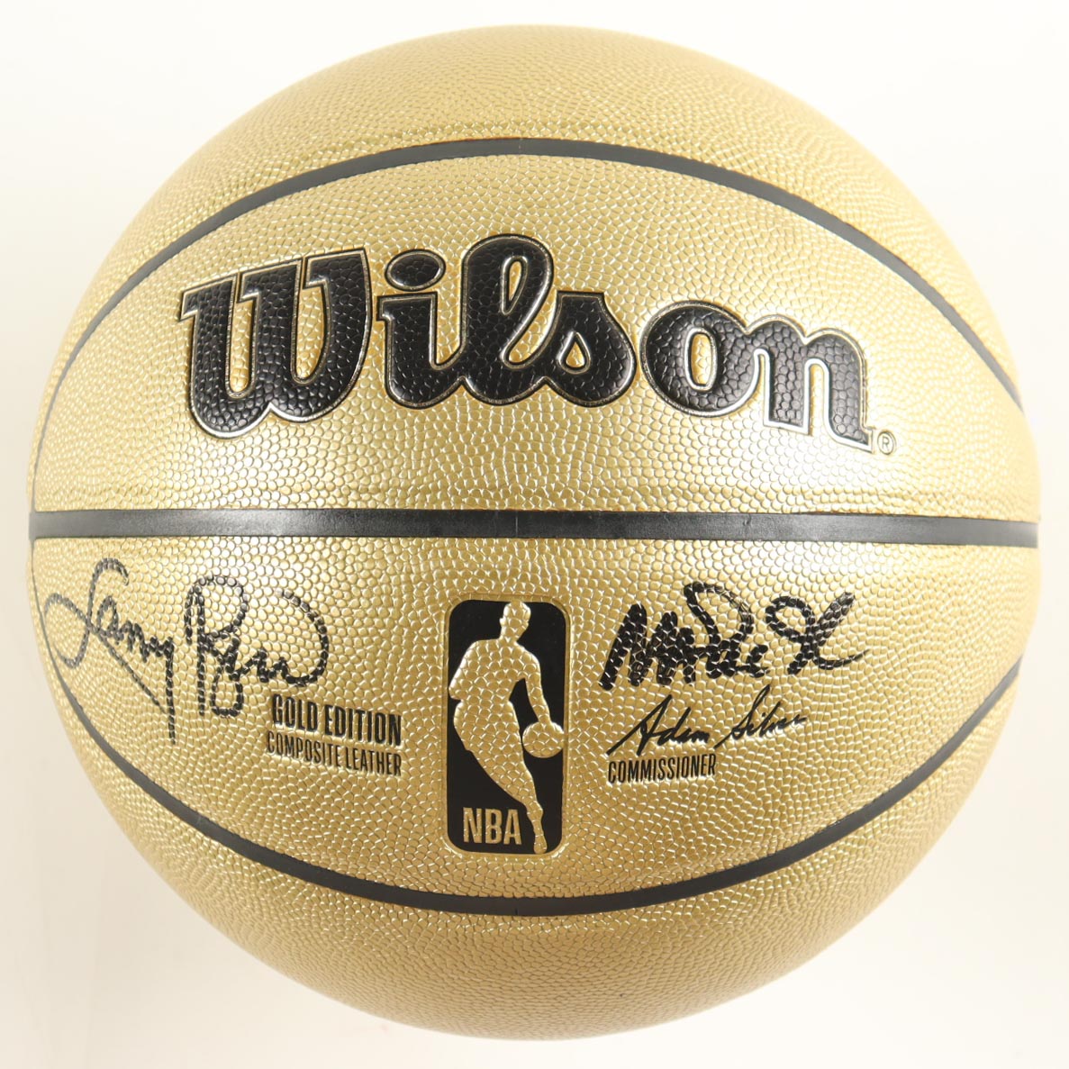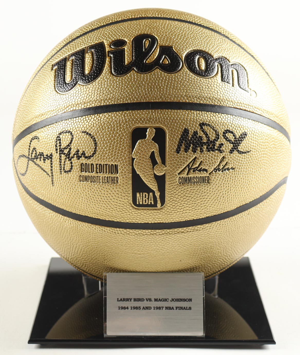 Wilson Gold Edition basketball With Display Stand has been hand-signed by Larry Bird (Boston Celtics, HOF) & Magic Johnson (Los Angeles Lakers, HOF).