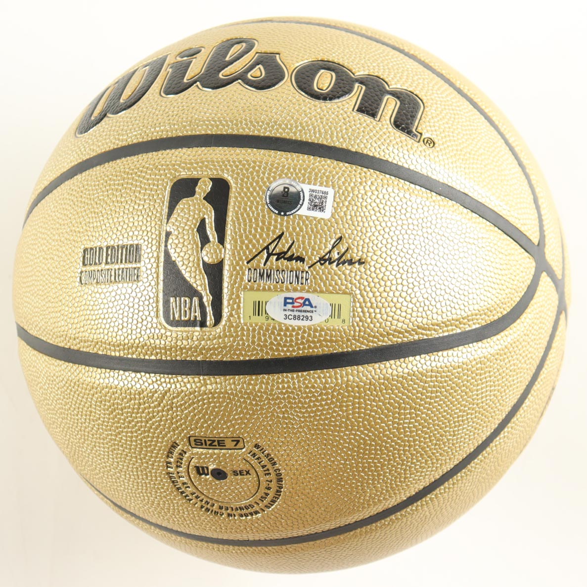 Larry Bird & Magic Johnson Signed NBA Basketball With Display Stand (PSA & Beckett)