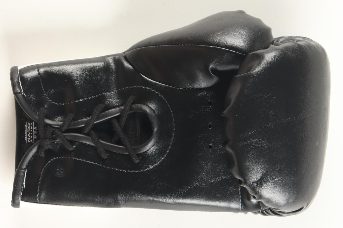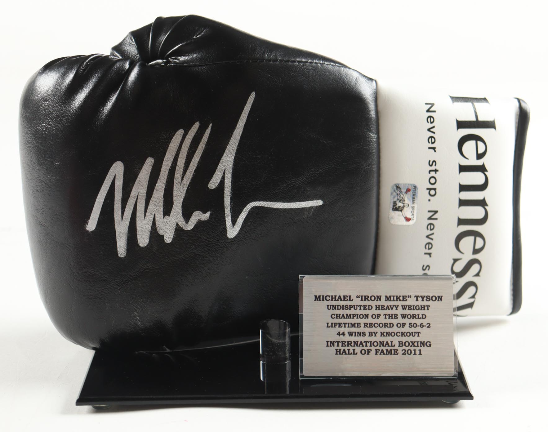 Hennessy boxing glove. The glove has been hand-signed by Mike Tyson (HOF). The display stand and plaque are included as shown.