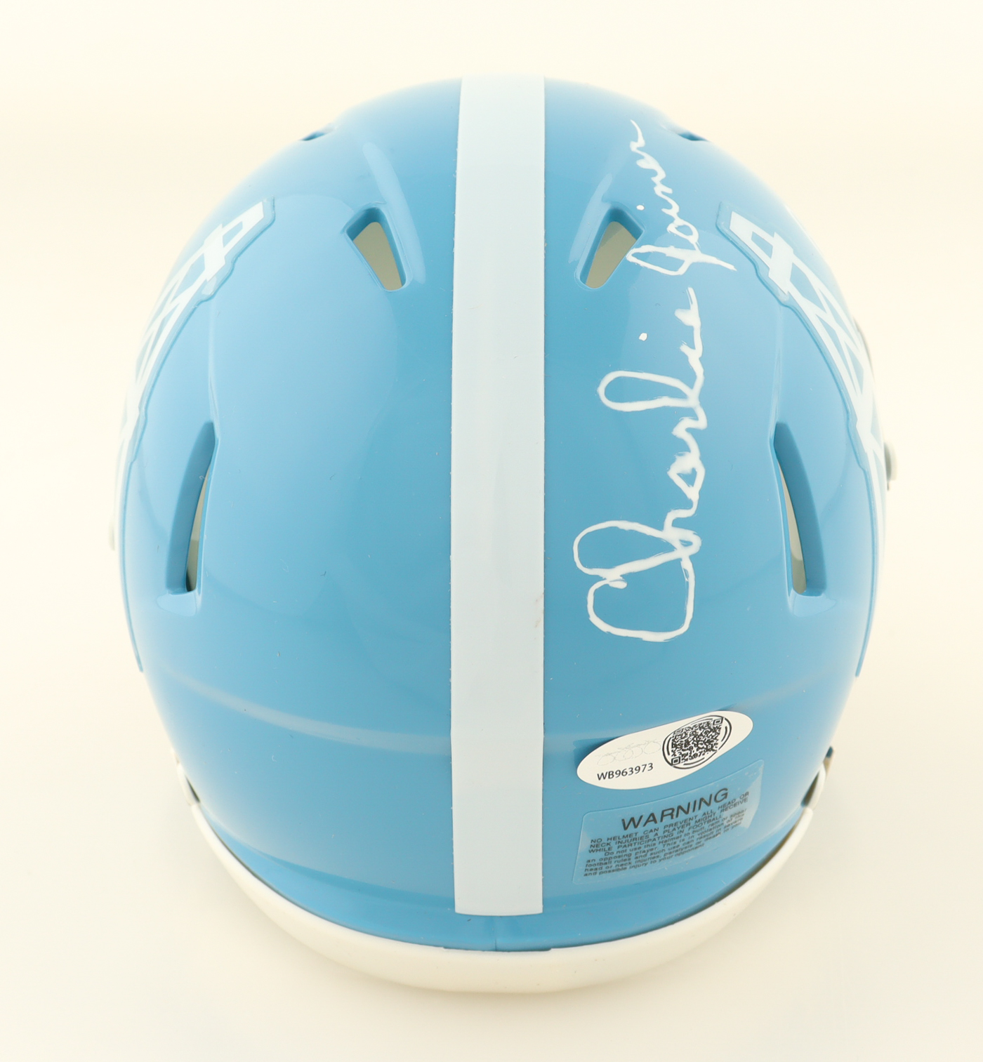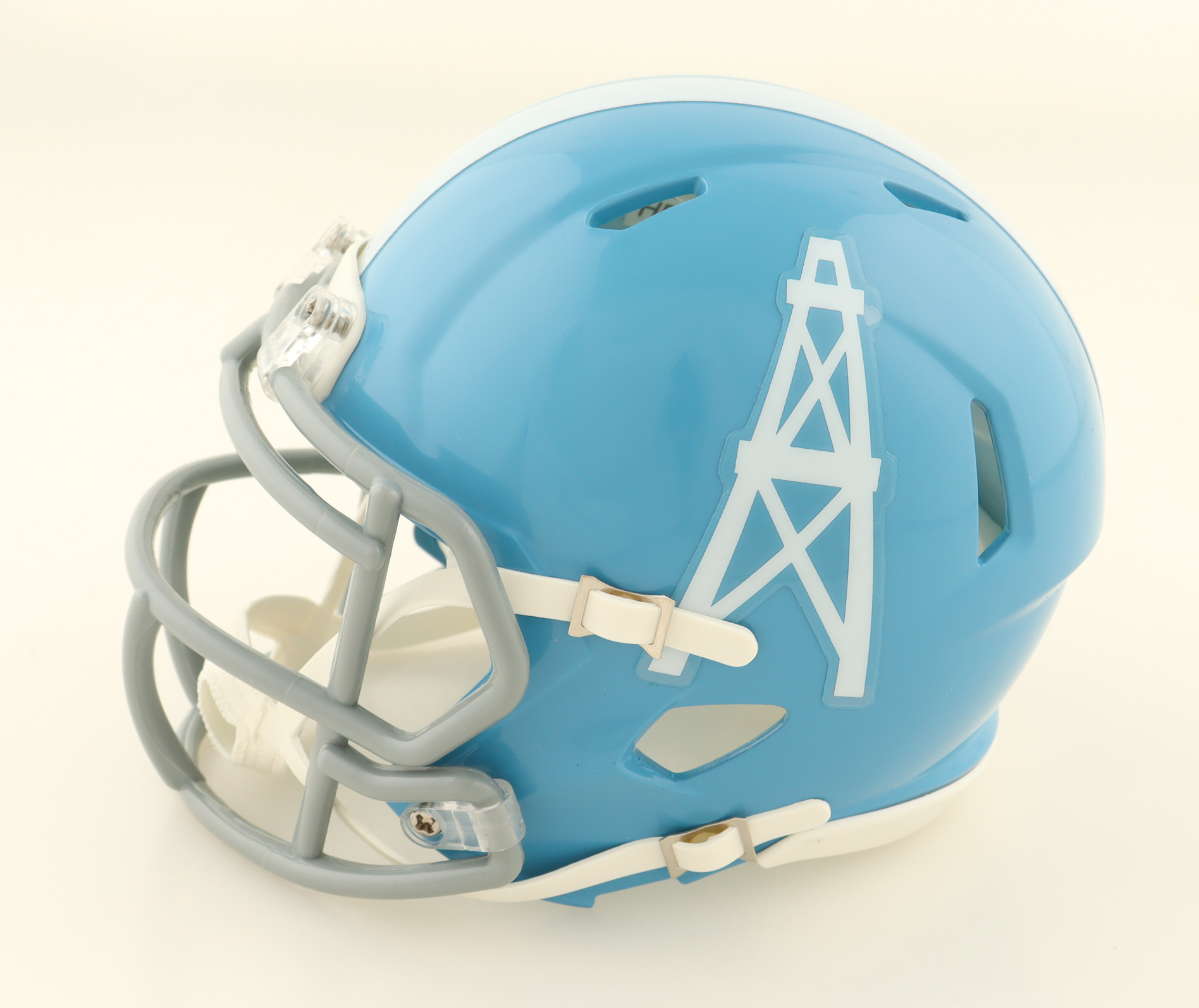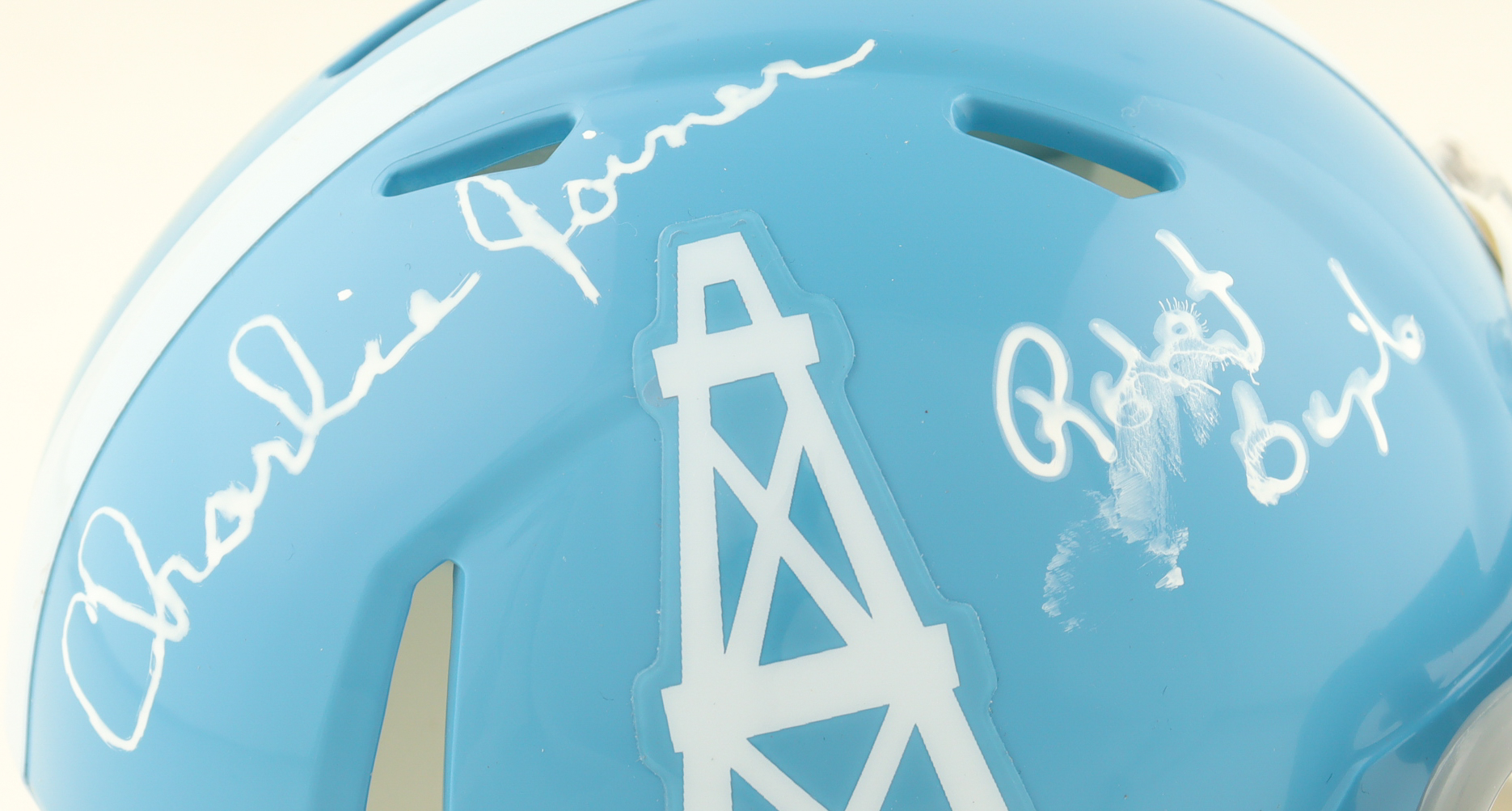 Riddell Houston Oilers Throwback Speed mini helmet. Hand-signed by Robert Brazile (HOF) and Charlie Joiner (HOF). Please note that Robert Brazile signature is smeared.