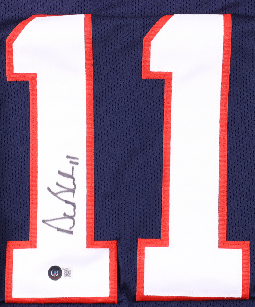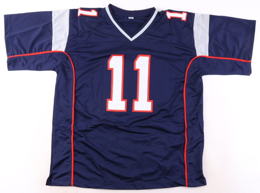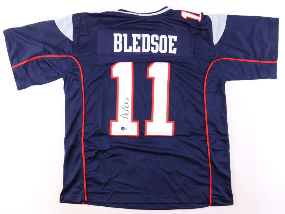Custom jersey with everything sewn on, size XL. Hand-signed by Drew Bledsoe.