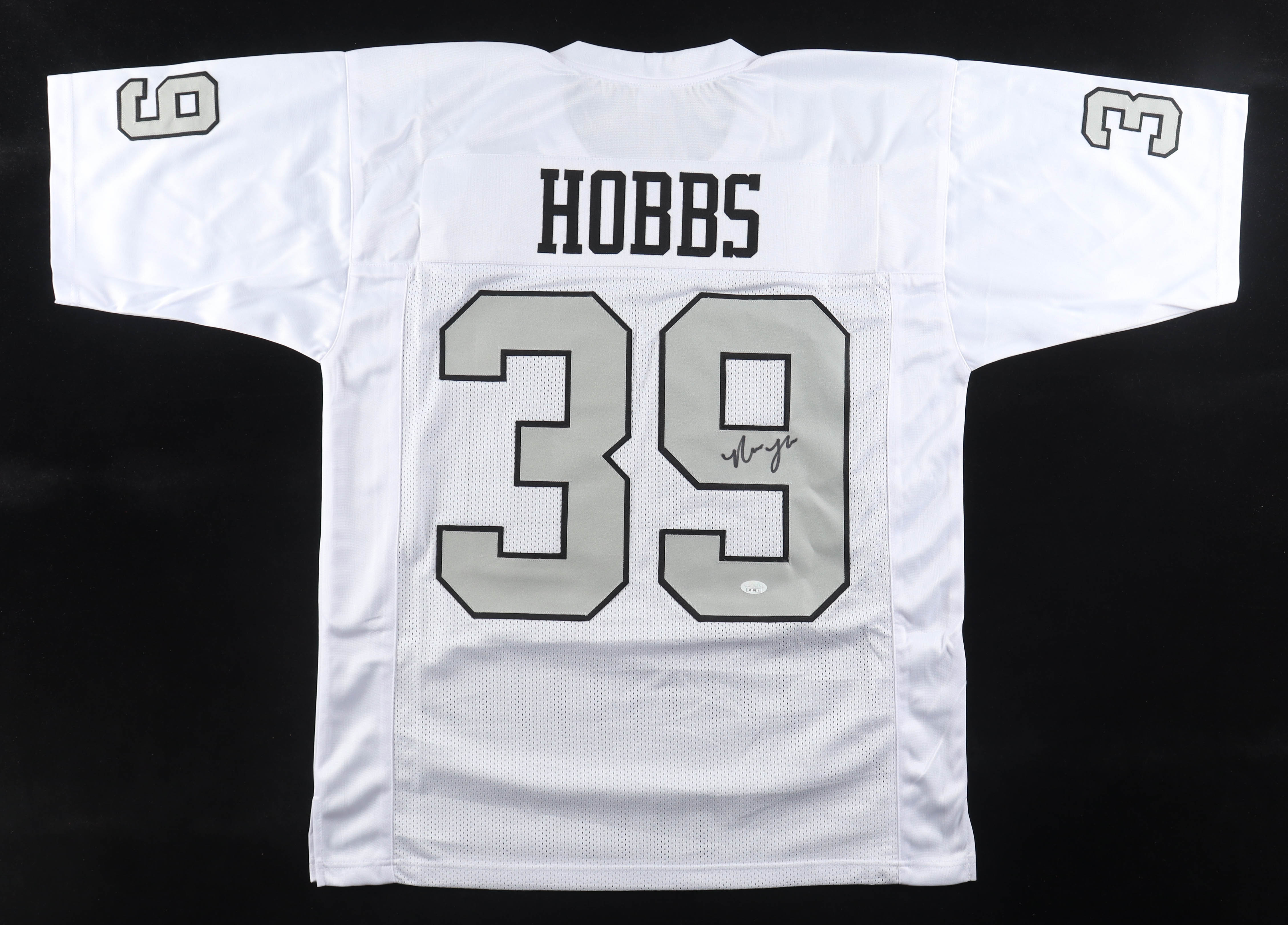 Custom jersey with everything sewn on, size L. Hand-signed by Nate Hobbs.