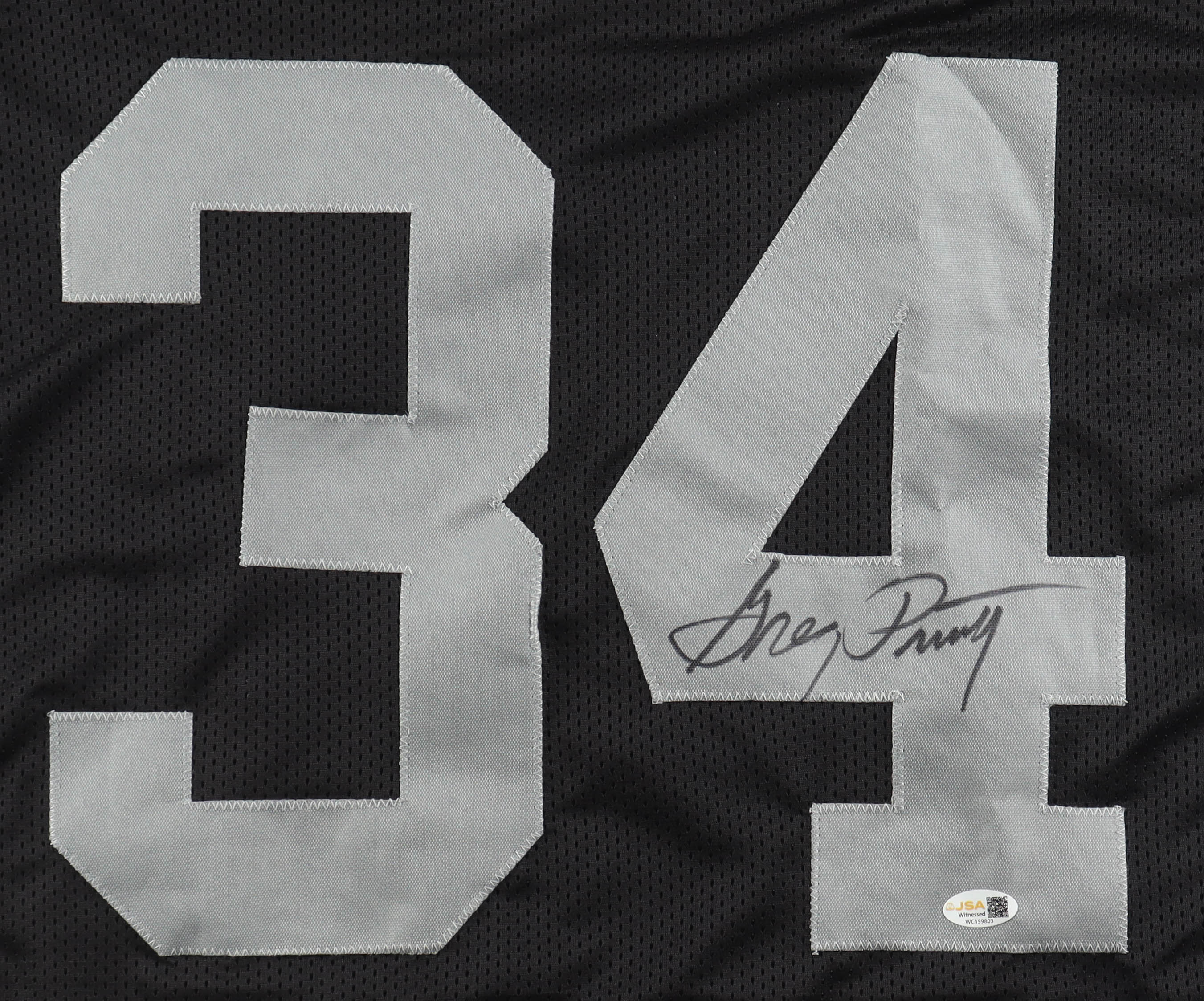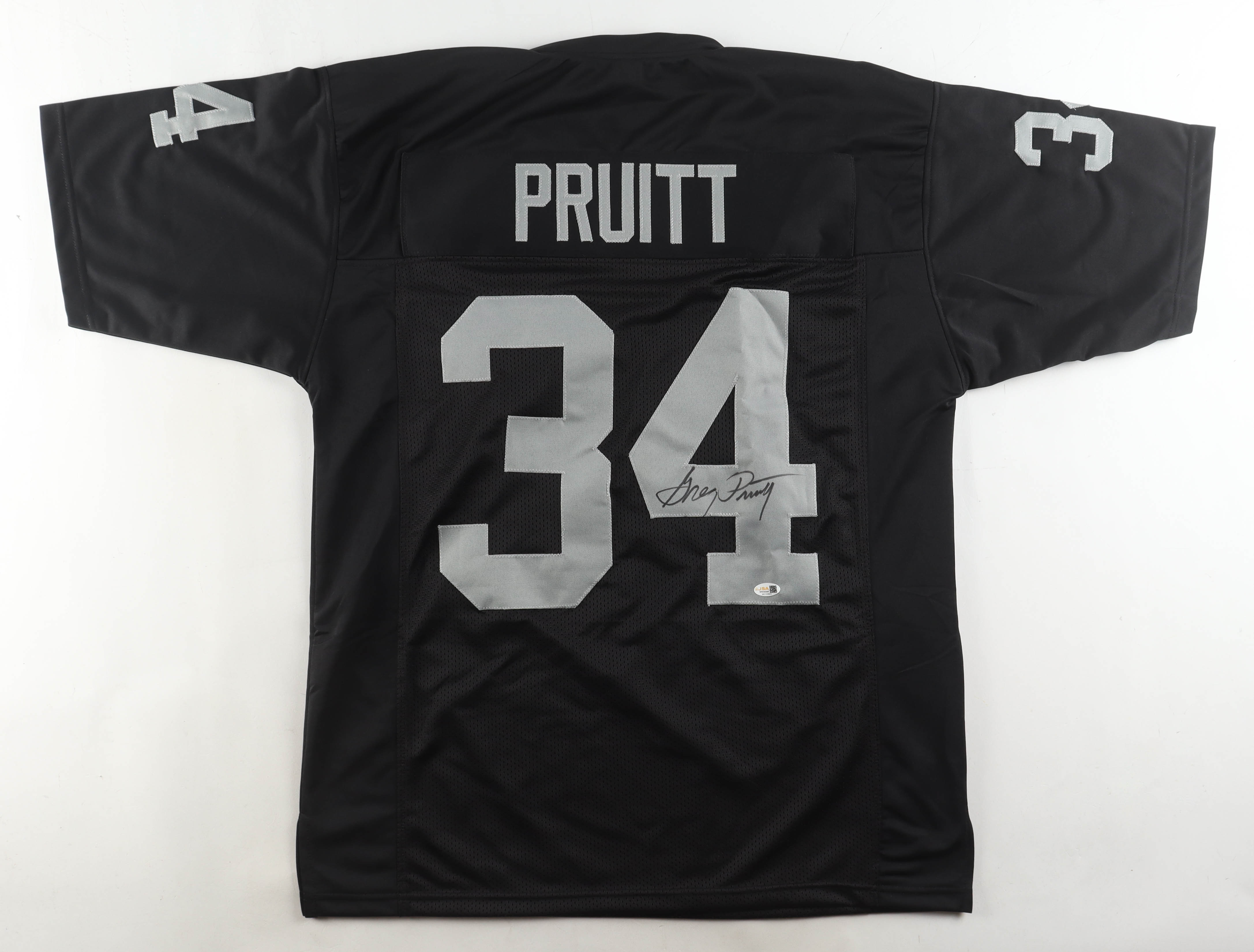 Custom jersey with everything sewn on, size XL. Hand-signed by Greg Pruitt.