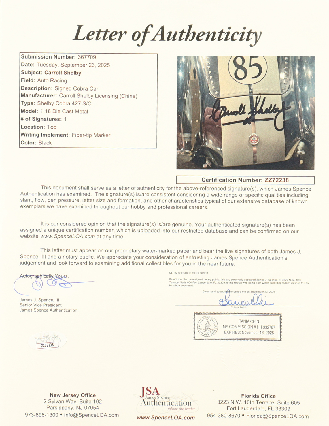 Carroll Shelby Signed Rare "Shelby Collectibles" 1965 Shelby Cobra 427 S/C 85th Birthday Edition 1:18 Chrome Diecast Car (JSA)