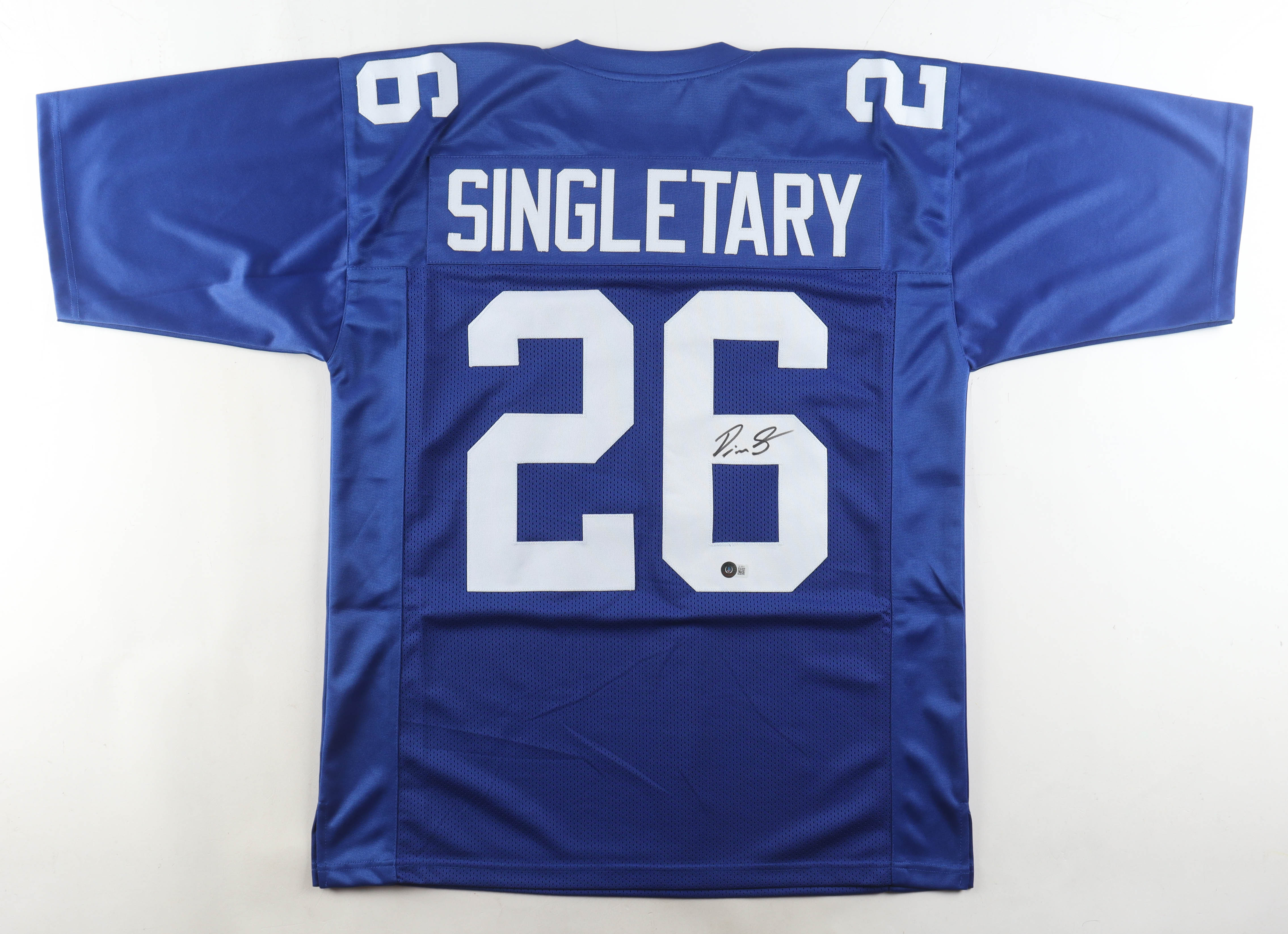 Custom jersey with everything sewn on, size XL. Hand-signed by Devin Singletary.