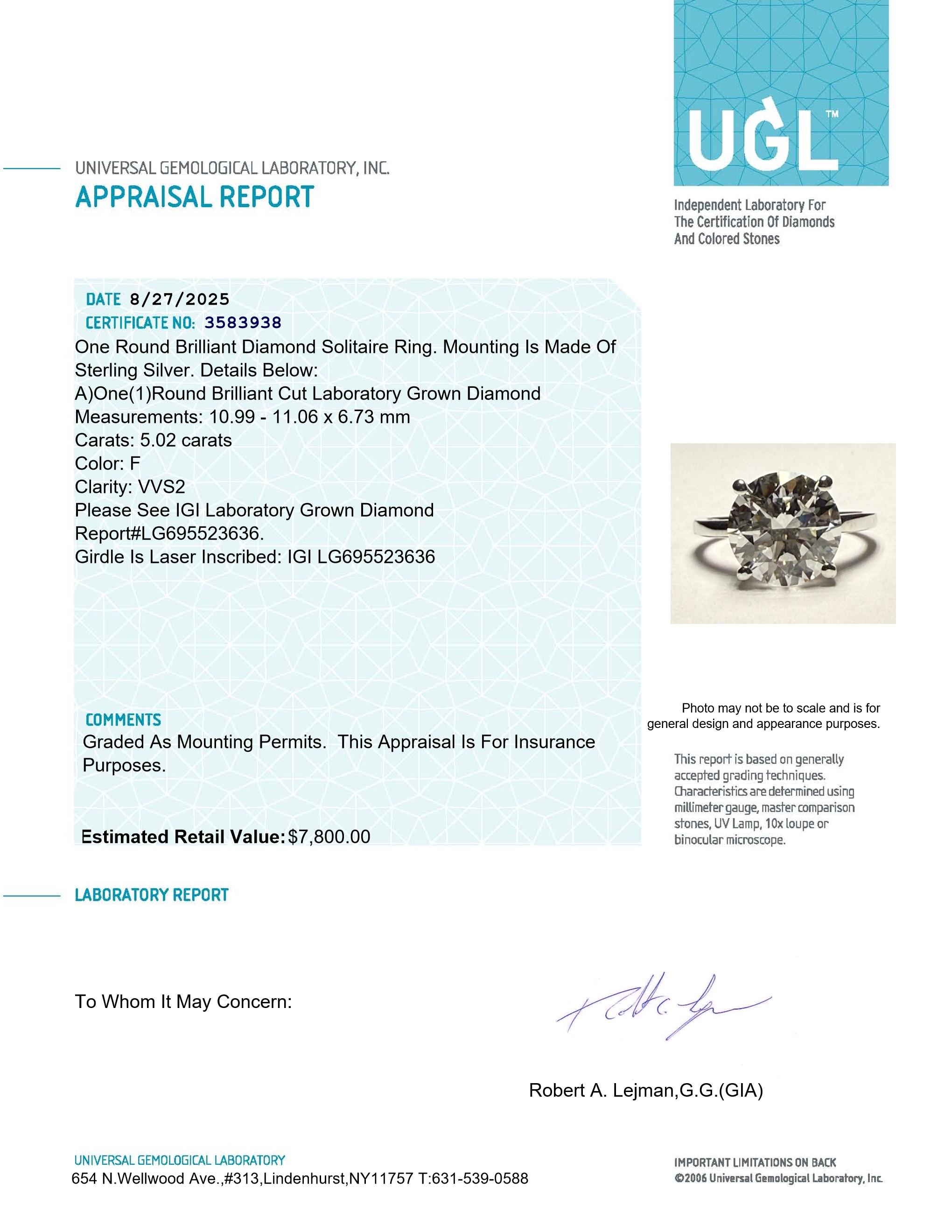 New 5.02 Carats Lab Grown Ideal Cut Diamond Ring F, VVS2 | Estimated Retail Value: $7,800 (UGL & IGI)