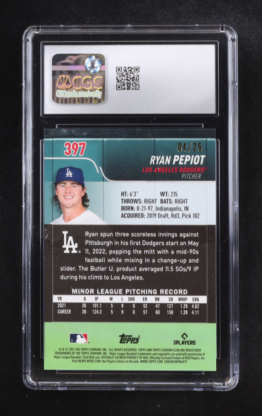 Ryan Pepiot 2022 Stadium Club Chrome Orange Refractor #397 RC #04/25 (CGC 7)