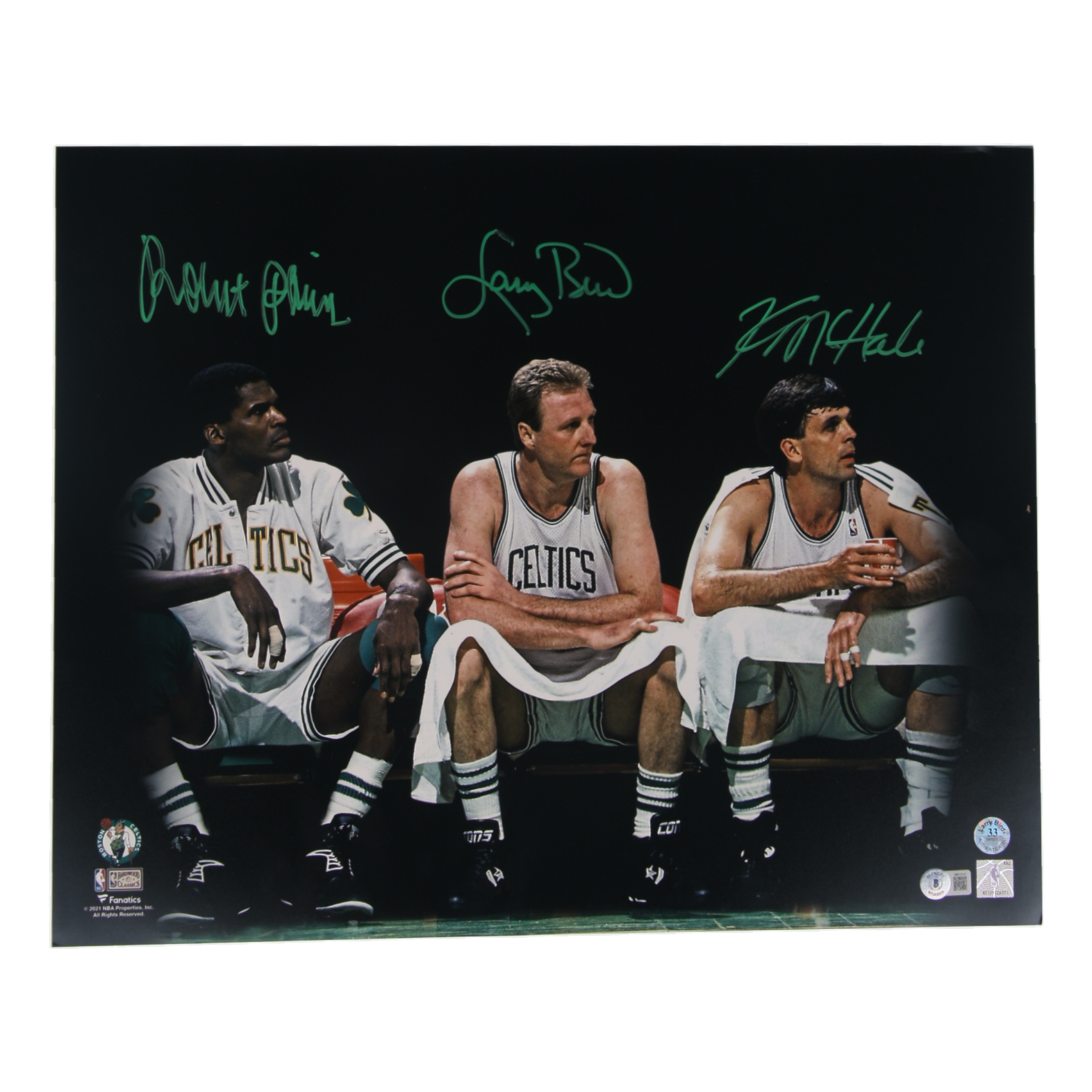 Photo measures 16" x 20" in size and has been hand-signed by Robert Parish, Larry Bird (HOF), Kevin McHale.