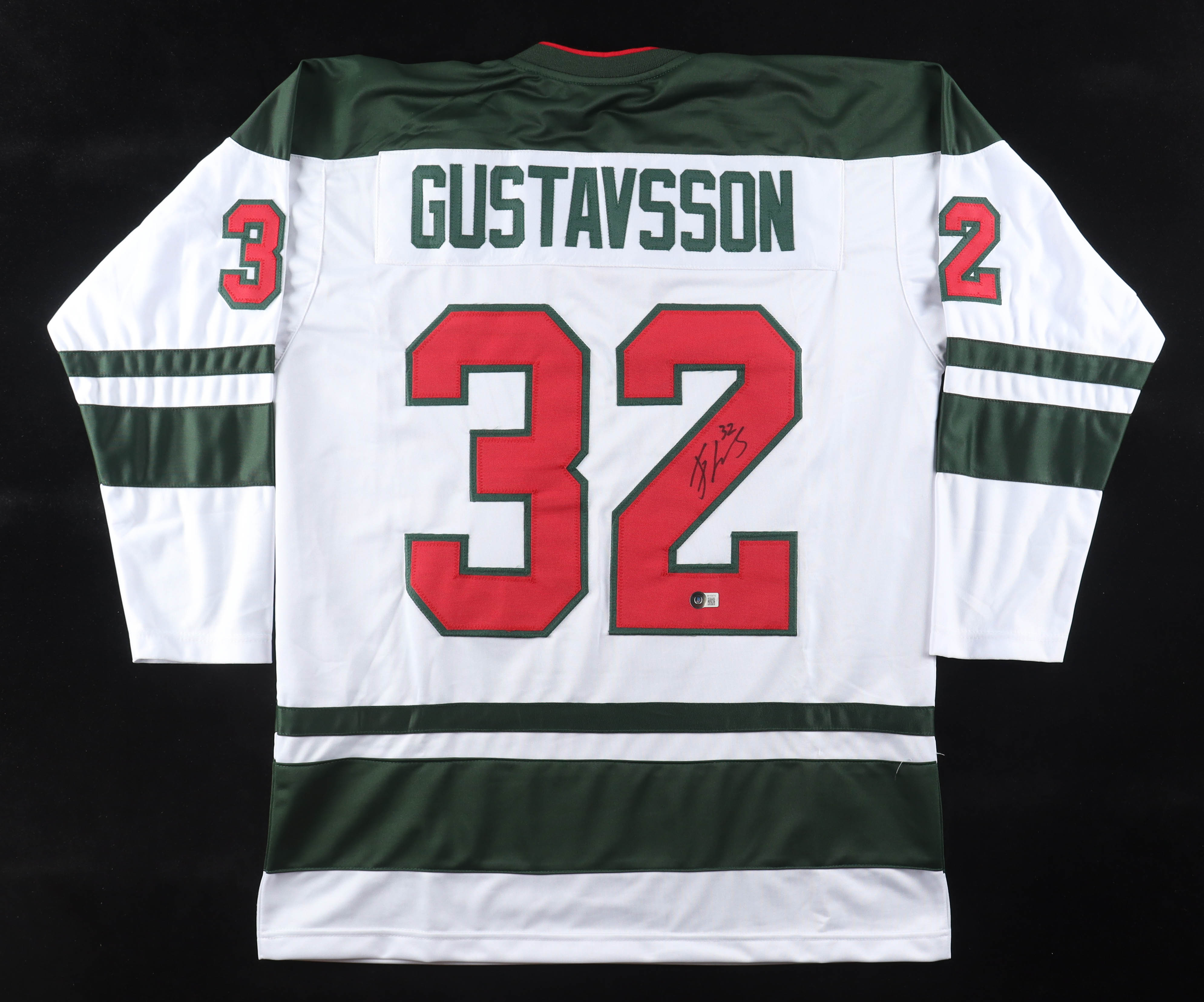 Custom jersey with everything sewn on, size XL. Hand-signed by Filip Gustavsson (Minnesota Wild).
