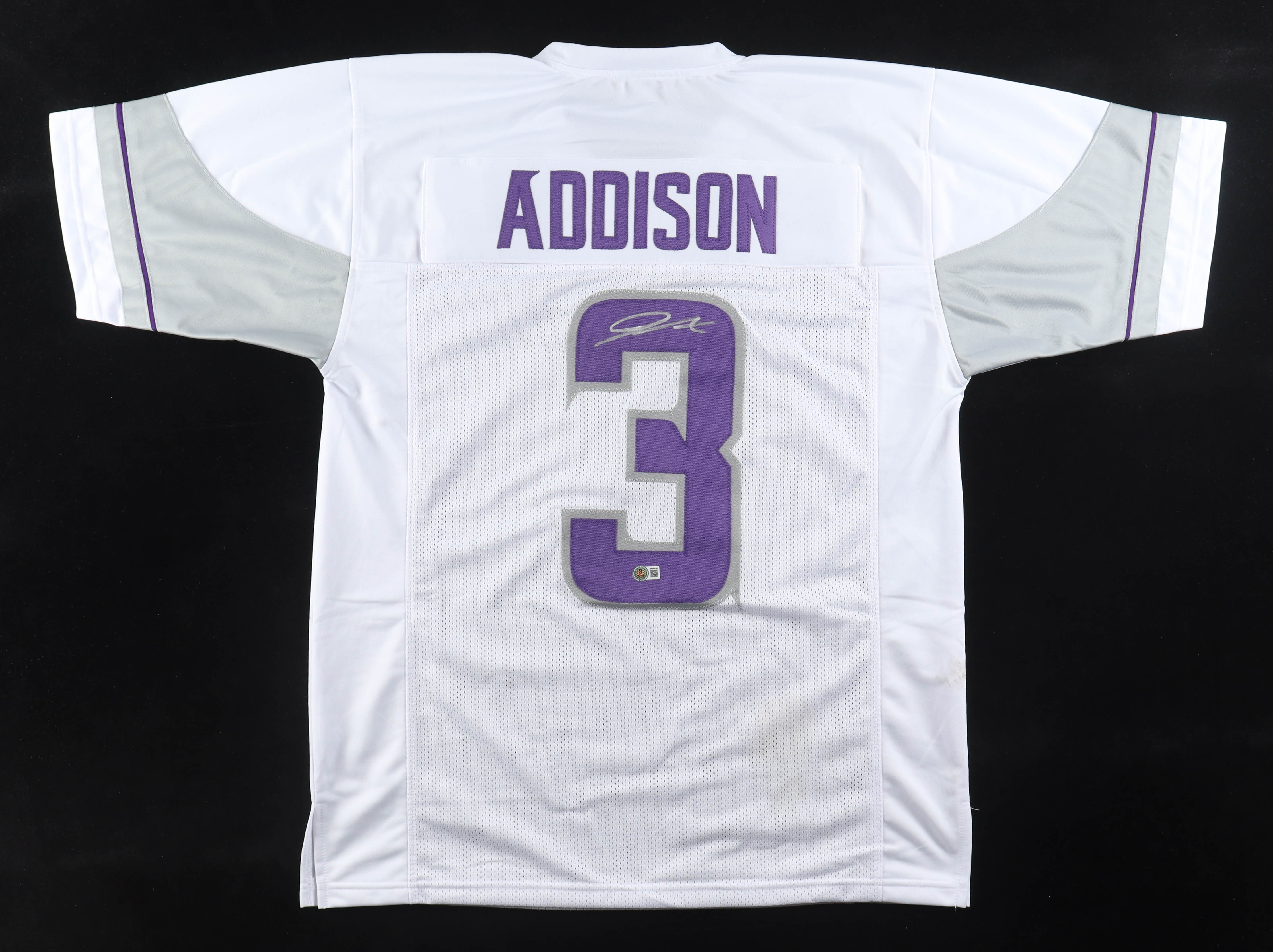 Custom jersey with everything sewn on, size XL. Hand-signed by Jordan Addison (Minnesota Vikings). Please note, the jersey shows multiple stains. See photos for more detail regarding the condition of the item.
