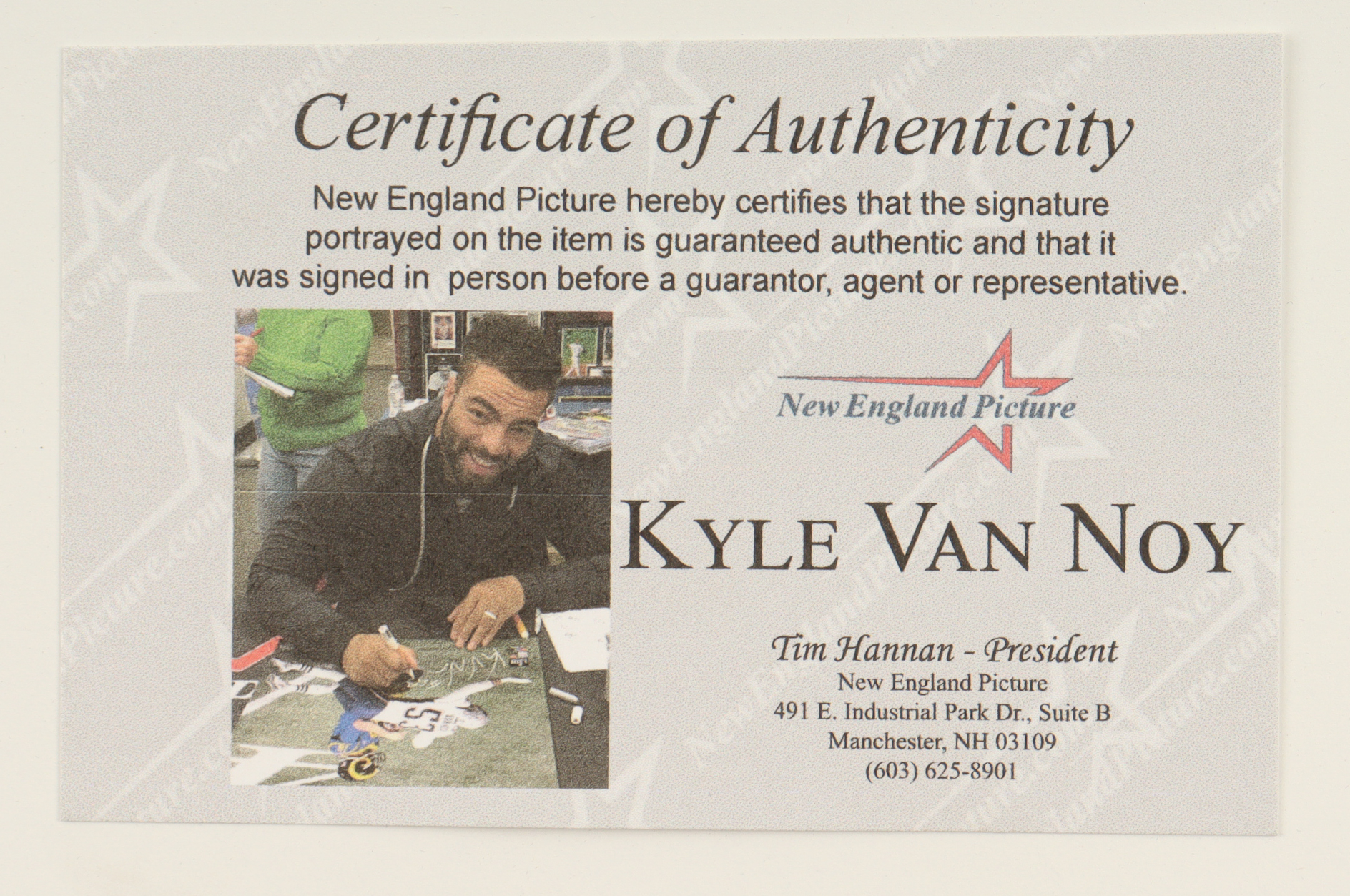 Custom frame measures 23" x 27" in size. 16" x 20" photograph has been hand-signed by Kyle van Noy (New England Patriots). Display also includes a name plaque.