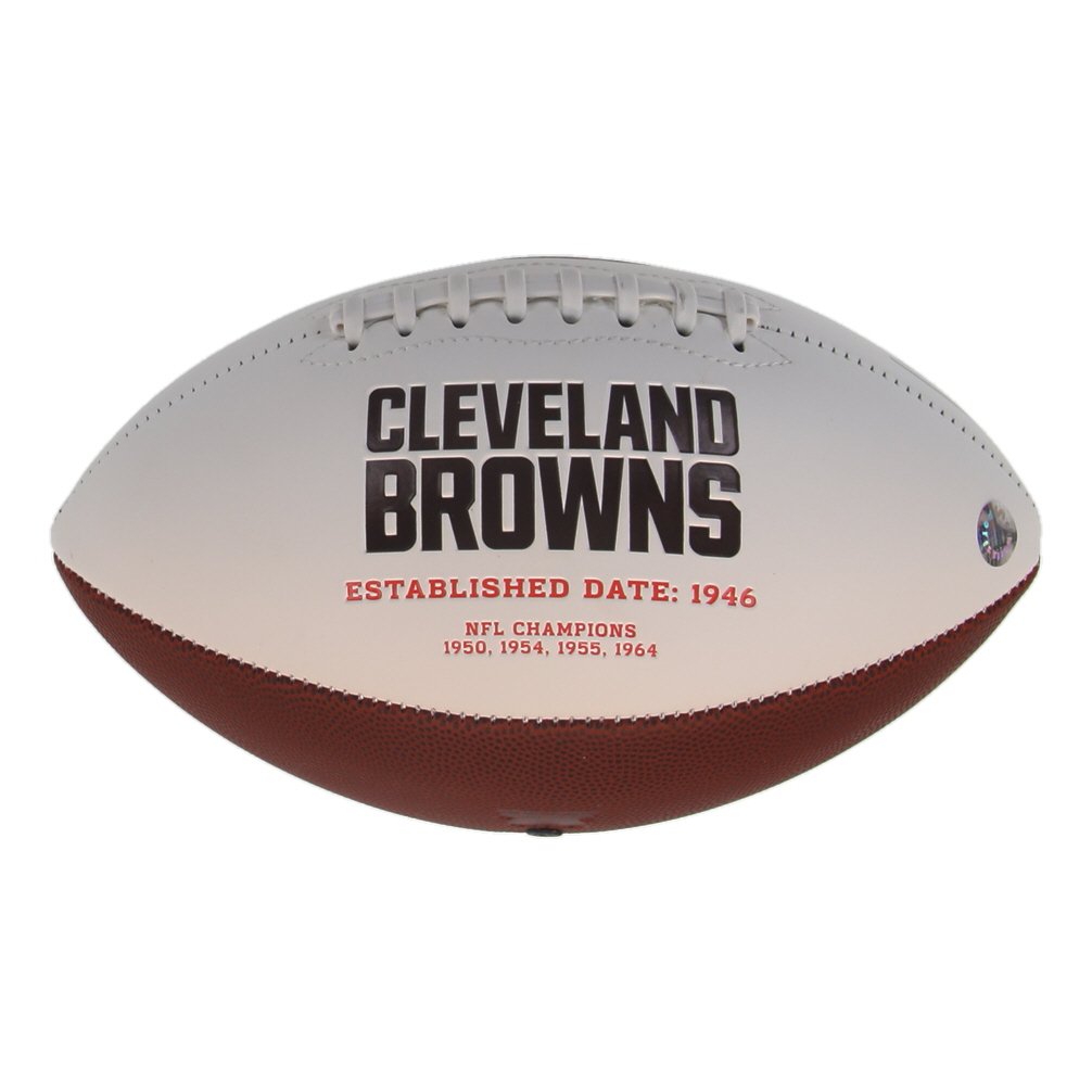 Cleveland Browns logo full-size football has been hand-signed by Jim Brown (D.2023, Cleveland Browns, HOF).