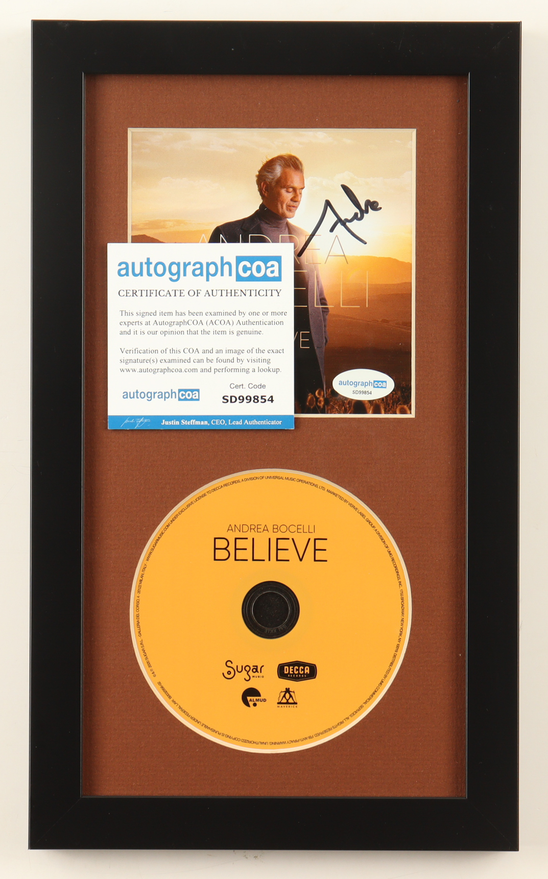 Andrew Bocelli Signed "Believe" Custom Framed CD Insert Display (ACOA)