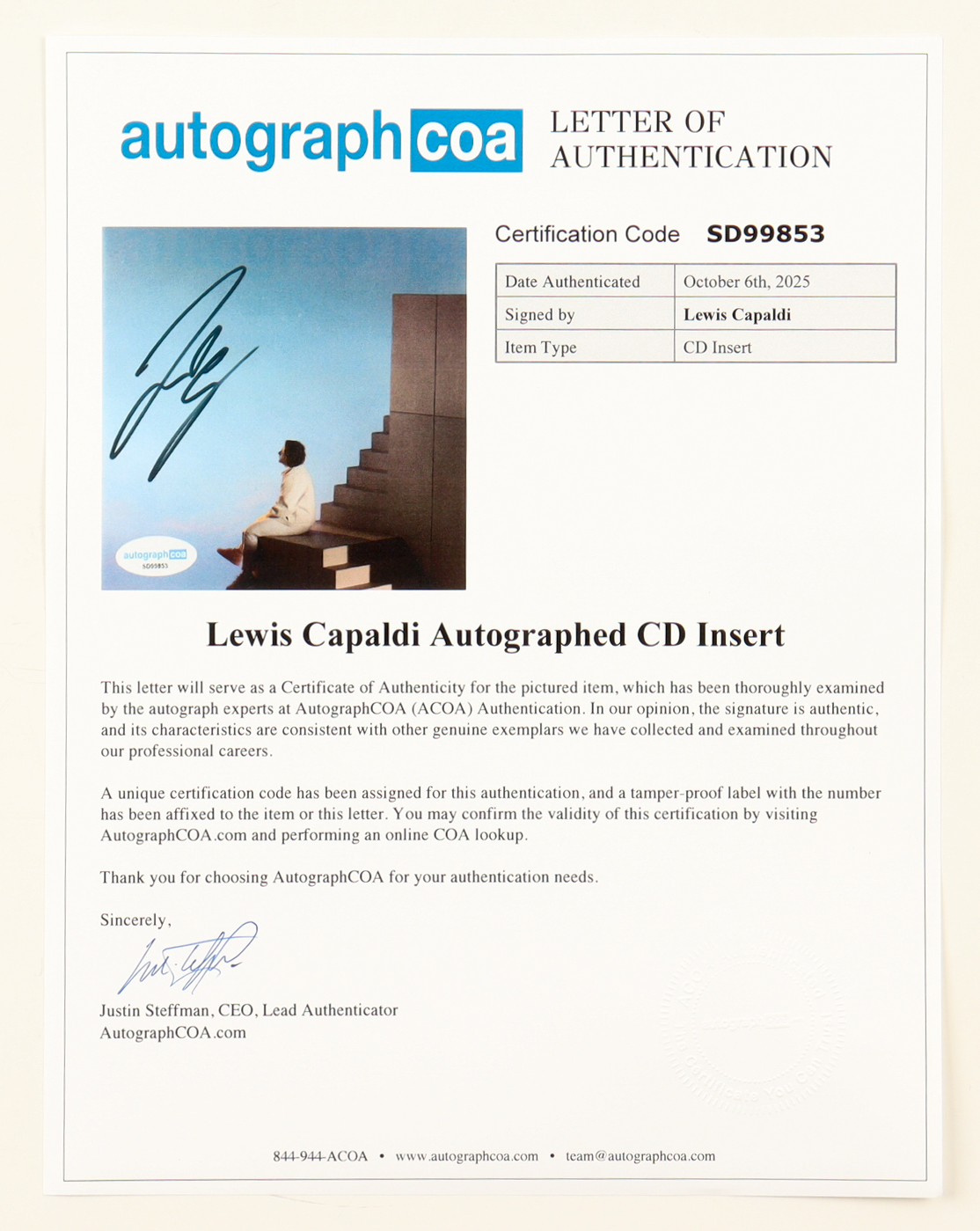 Matted insert display measures approximately 8" x 13.5" in size. Features a CD insert that has been hand-signed by Lewis Capaldi. Please note, the CD is included. Refer to photos for more details.