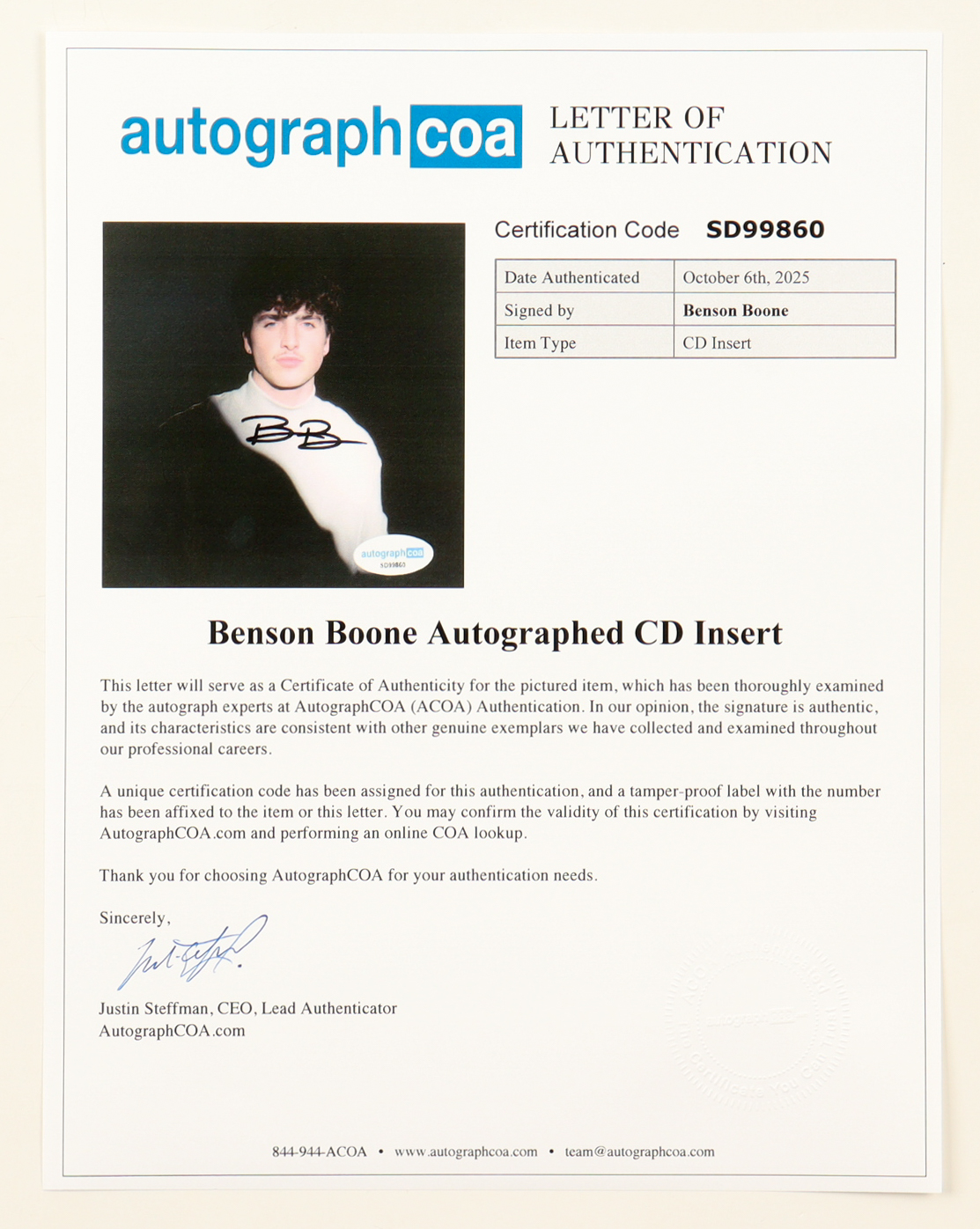 Matted insert display measures approximately 8" x 13.5" in size. Features a CD insert that has been hand-signed by Benson Boone. Please note, the CD is included. Refer to photos for more details.