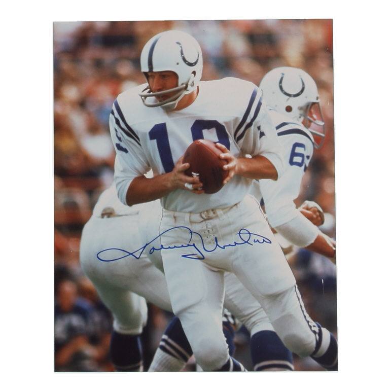 Photo measures 8" x 10" in size and has been hand-signed by Johnny Unitas (D. 2002, Baltimore Colts, HOF)
