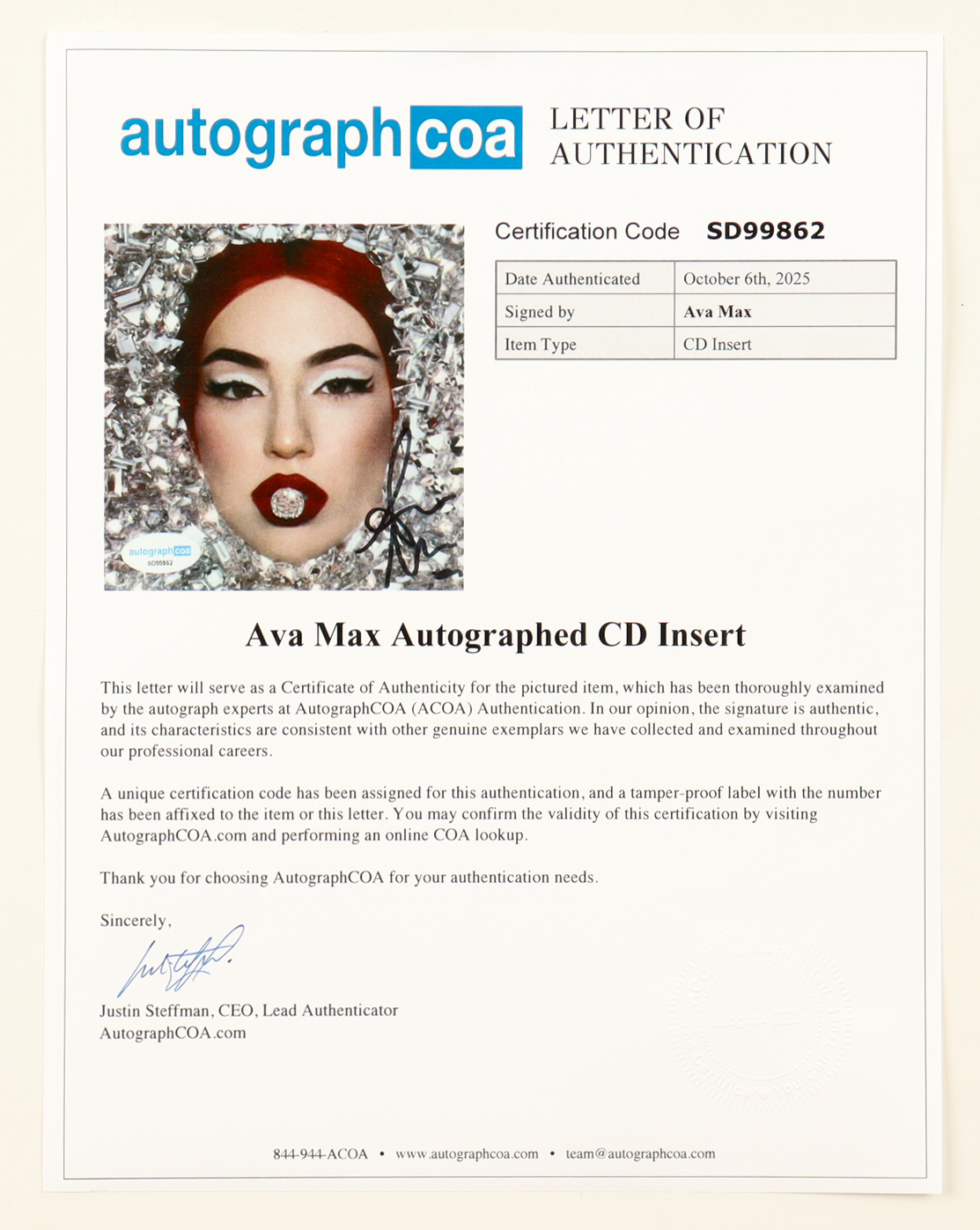 Matted insert display measures approximately 8" x 13.5" in size. Features a CD insert that has been hand-signed by Ava Max. Please note, the CD is included. Refer to photos for more details.