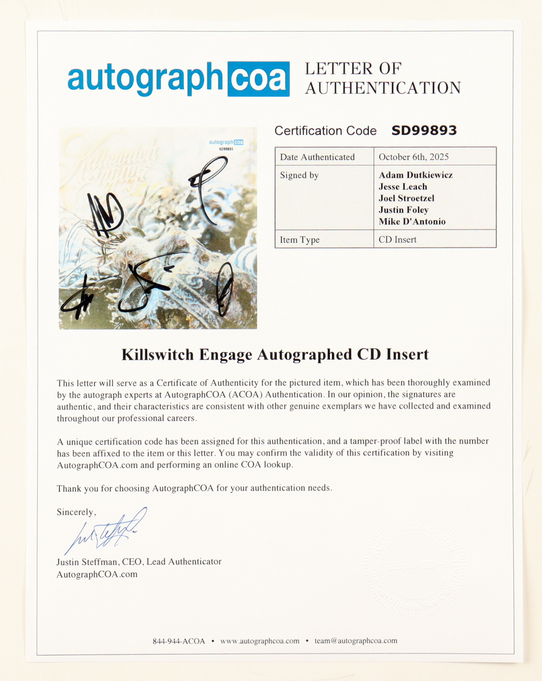 Matted insert display measures approximately 8" x 13.5" in size. Features a CD insert that has been band-signed by (5) with with Jese Leach, Joel Stroetzel, Justin Foley, Mike D'Antonio and Adam Dutkiewicz. Please note, the CD is included. Refer to photos for more details.