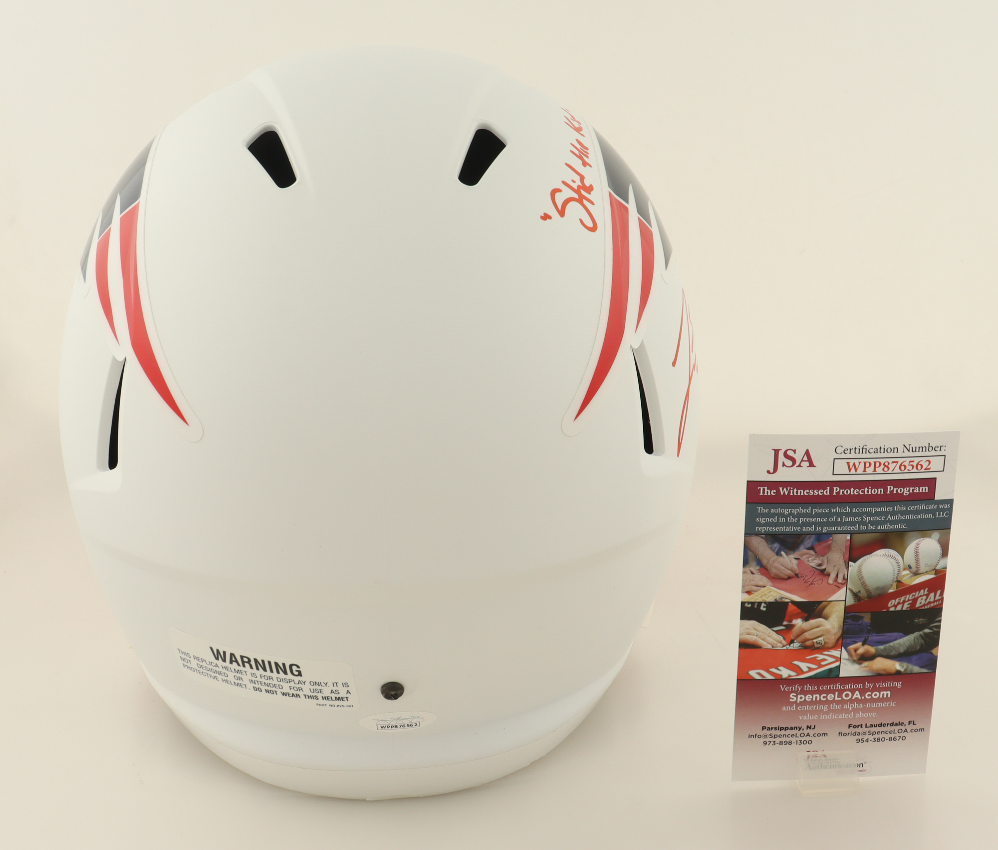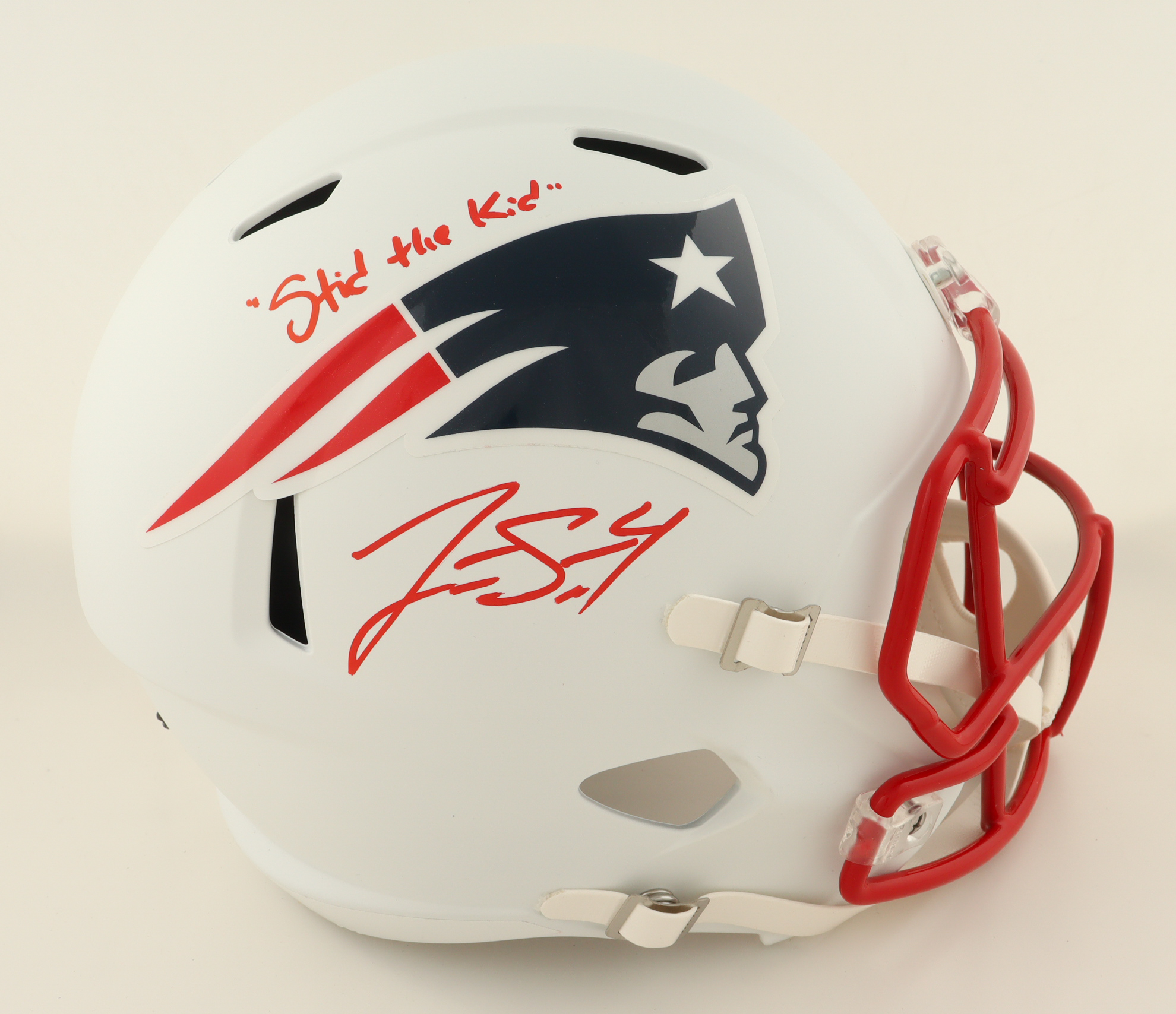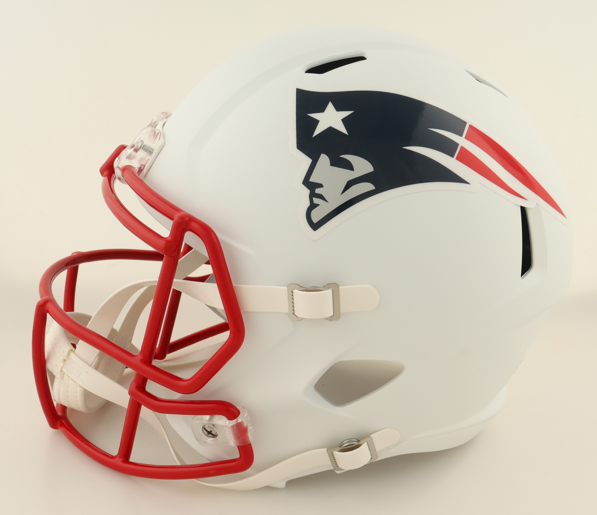 Riddell New England Patriots Full-Size Flat White Alternate Speed replica helmet. Hand-signed and inscribed by Jarrett Stidham.