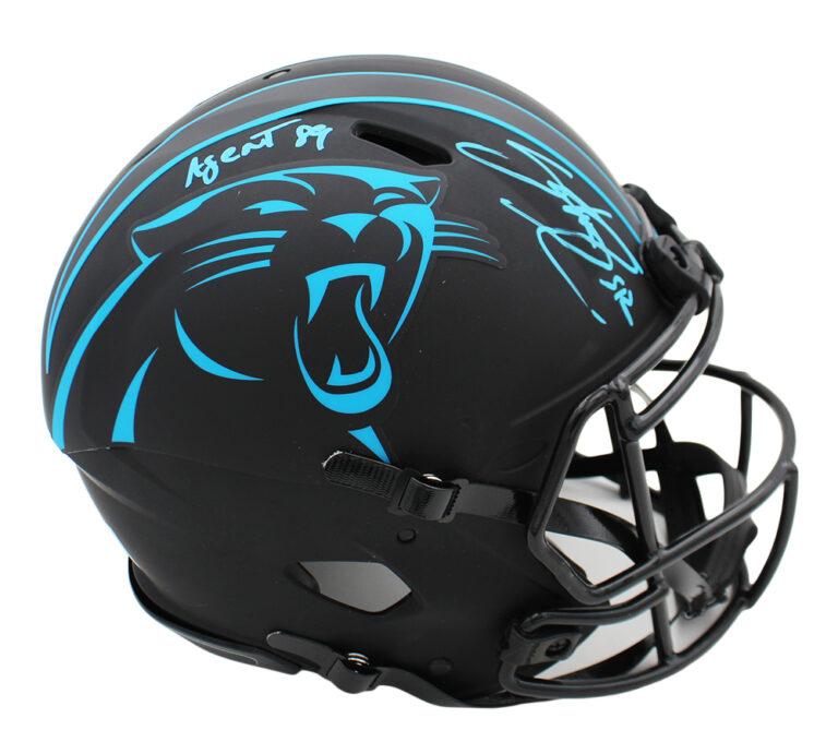 Riddell Carolina Panthers full-size authentic on-field eclipse alternate speed helmet has been hand-signed and inscribed by Steve Smith Sr.