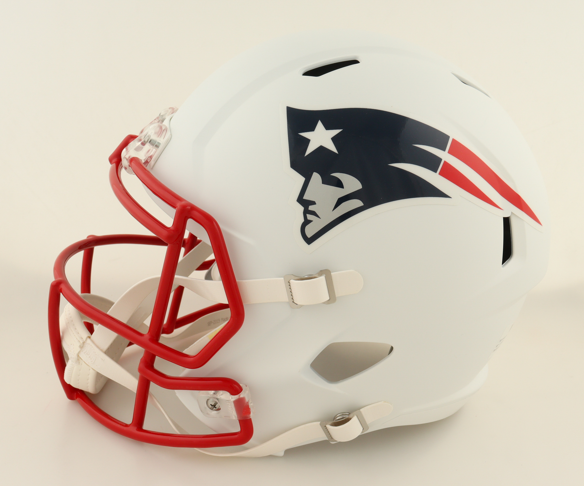Riddell New England Patriots Full-Size Flat White Alternate Speed replica helmet. Hand-signed and inscribed by Jarrett Stidham.