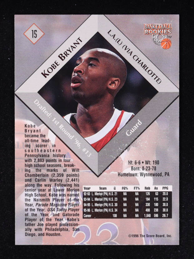 Kobe Bryant 1996 Score Board Basketball Rookies #15 RC