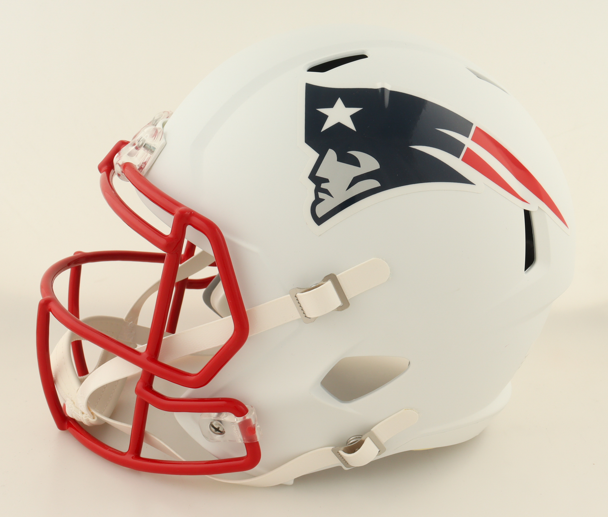 Riddell New England Patriots White Alternate Full-Size Replica Speed Helmet has been hand-signed by Mac Jones. Please note, there is slight scuffing on the helmet.