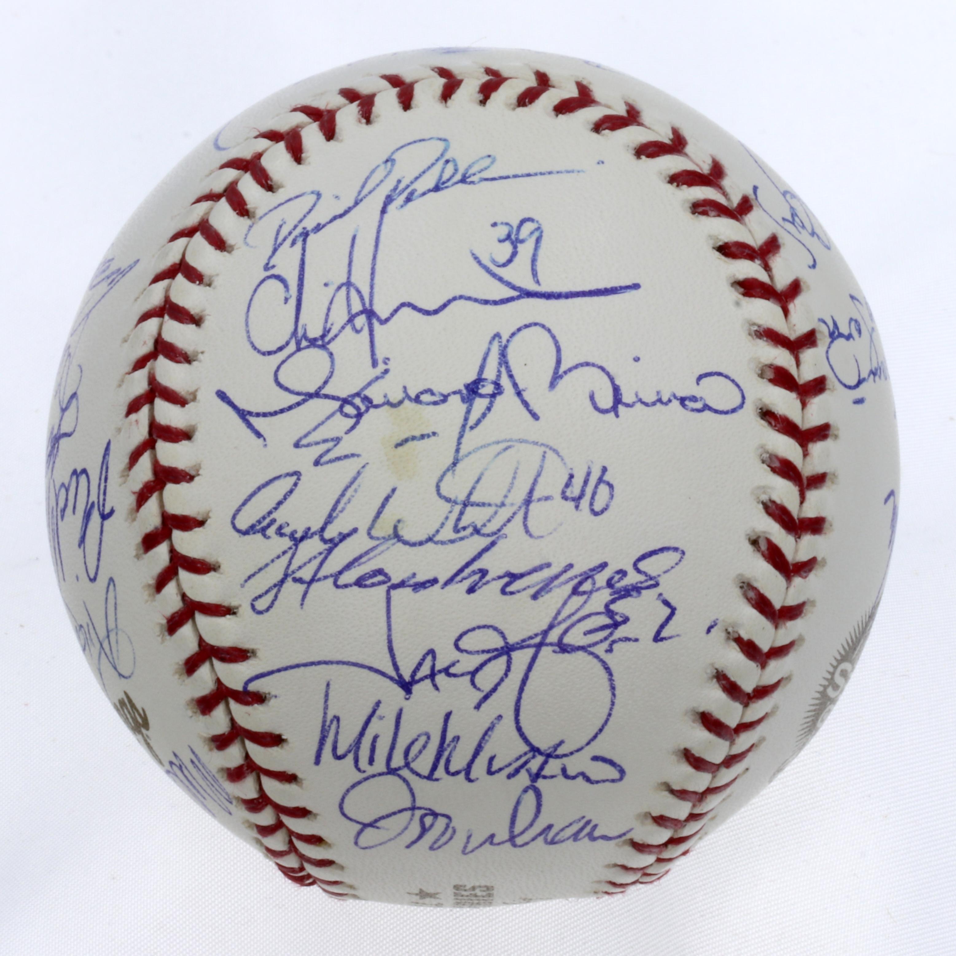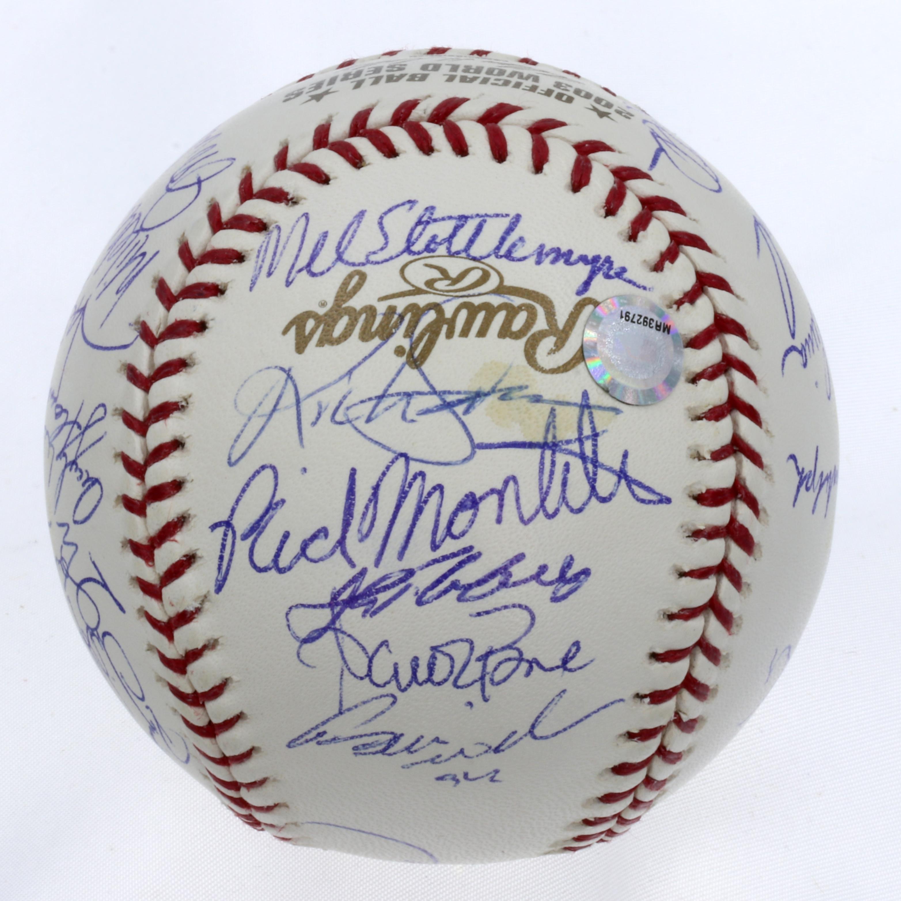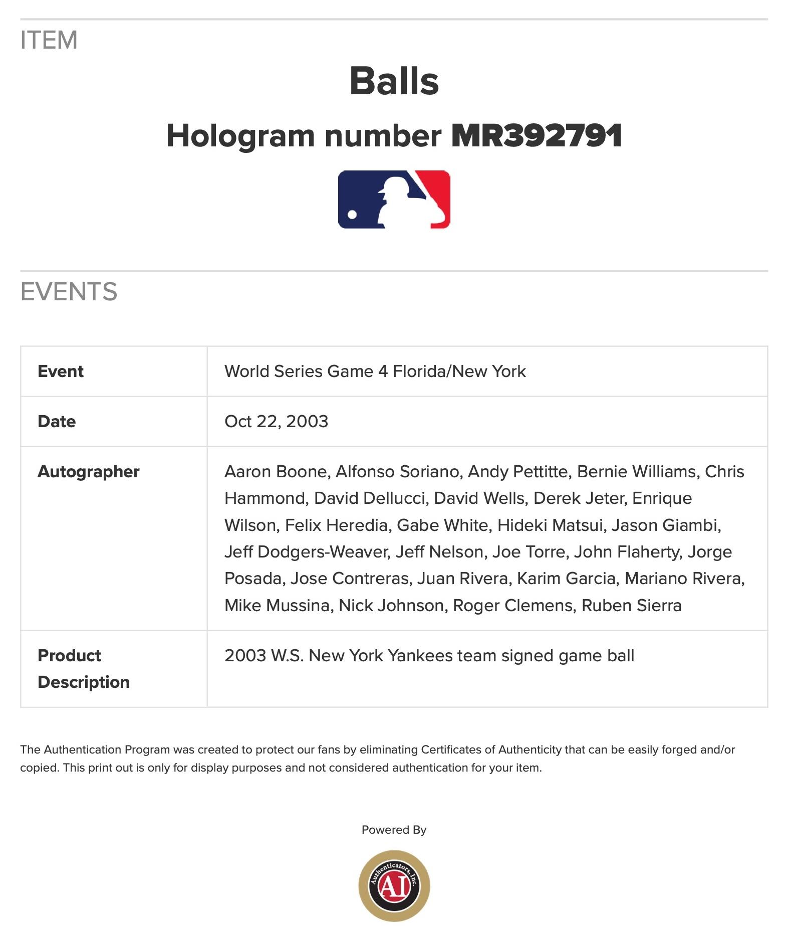 Rawlings Official 2003 World Series baseball has been hand-signed by (31) members of the New York Yankees including Hall of Famers Derek Jeter, Joe Torre, and Mariano Rivera!