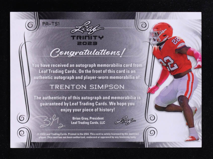 Trenton Simpson 2023 Leaf Trinity Patch Autographs Black Silver #PATS1 #1/1 RC